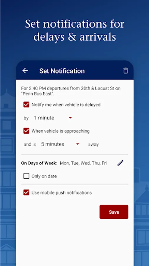Intelligent Notifications—subscribe to routes or stops to get arrival, departure, and delay information sent directly to your device.