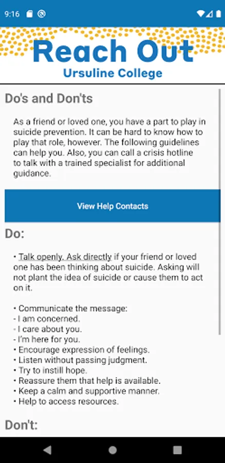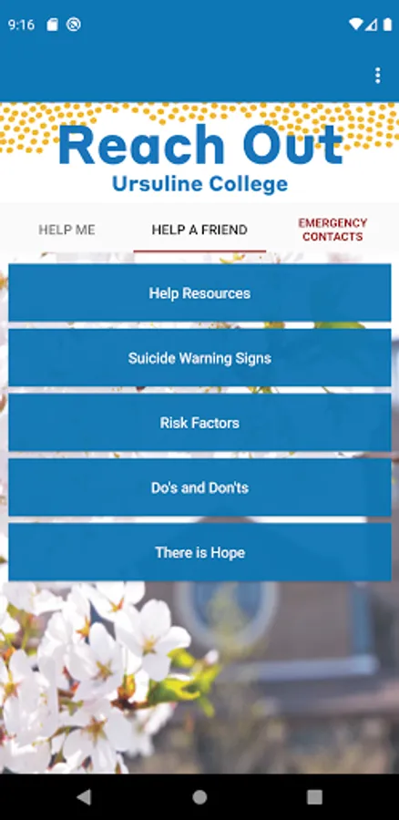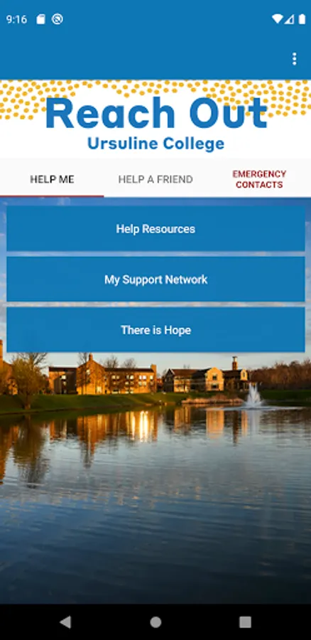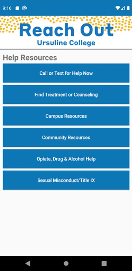 Ursuline College's Reach Out app provides quick access to guidance for supporting a friend in need, suicide prevention, or coping with mental health challenges. It also supplies information about resources, referrals, and counseling services offered on the campus and in the community, including crisis hotline numbers. The Reach Out app is designed for students, parents, friends of students, faculty, and staff of Ursuline College, located in Pepper Pike, Cuyahoga County, Ohio. The Reach Out app better prepares people to help a friend, loved one or themselves.