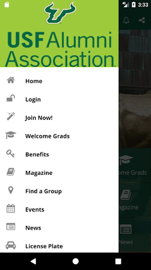 This app brings the power of the University of South Florida Alumni Association to your mobile device. Find an alumni group or a local USF event, read the USF magazine, travel with fellow Bulls, join the Alumni Association, get a Bulls license plate or VISA card. Members can also access a mobile membership card, access benefits and discounts on the go, and renew their membership. Always feel connected to USF. Live Green and Gold!
