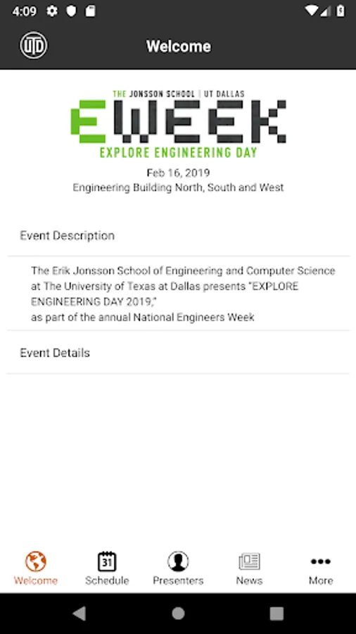 The Erik Jonsson School of Engineering and Computer Science at the University of Texas at Dallas invites the community to participate in its annual Explore Engineering Day, kicking off Engineers Week. This dedicated event app provides up-to-the-minute details including K-12 workshop schedules, Tech Talks, announcements, maps, parking, sponsors and more.