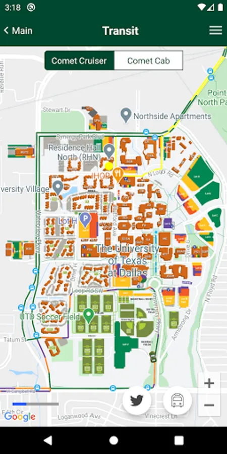 Comet Cab/Comet Cruiser—Verify routes and schedules for both the on-campus Comet Cab shuttle, and for the Comet Cruiser bus serving UT Dallas and the surrounding community. Locations are updated every 15 seconds.