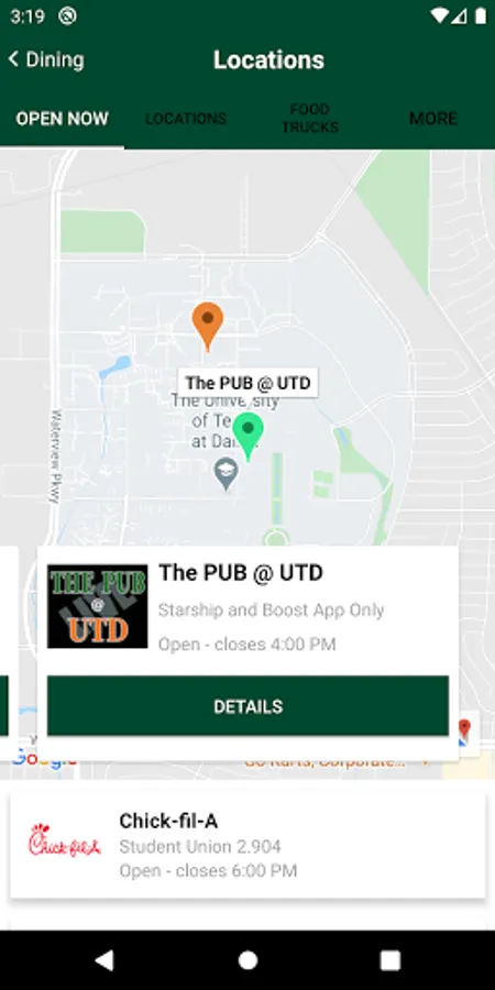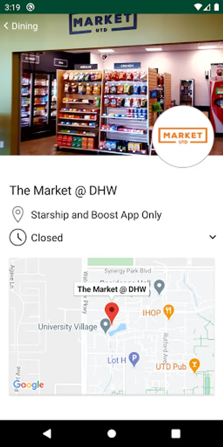 Dining —Show open restaurants and food trucks, order food online, find vending services.