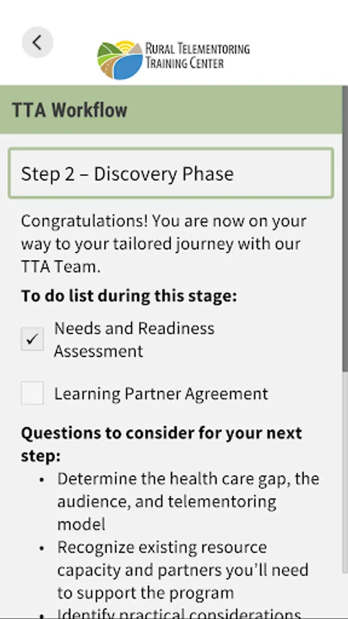 2. Descriptions and checklists of the steps through the RTTC's individualized technical assistance workflow to support teams through the launch and maintenance of their program.