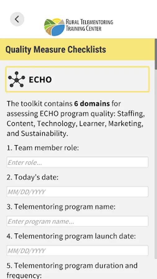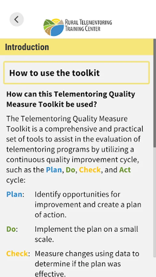 The Telementoring Quality Measure Toolkit Mobile App features resources to support the design, launch, and evaluation of telementoring programs that improve rural health. Telementoring is the use of telecommunication technology to deliver training, education, and support for health care workers. It can improve rural health by building local capacity, reducing professional isolation, improving access to care, and sharing best practices.