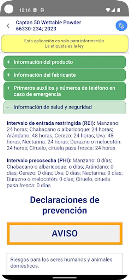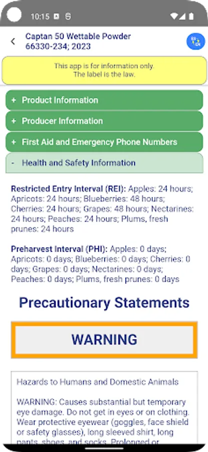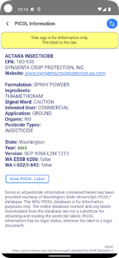 The app is for information and educational purposes only. It is not a substitute for obtaining and understanding the information on the pesticide labels. The information in this app has NO legal status. Remember THE LABEL IS THE LAW.