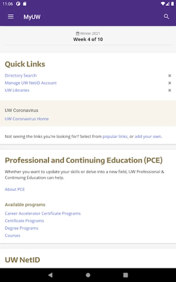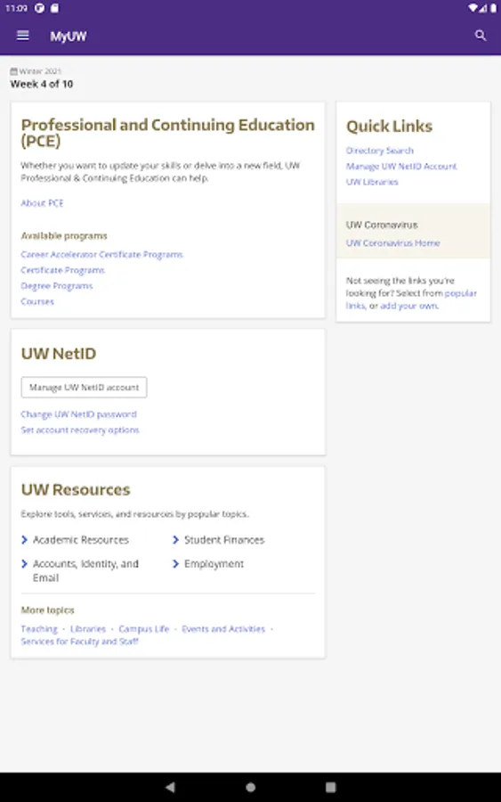 - Quick Links -- to UW Libraries, your personal information, Directory Search, managing your UW NetID account
