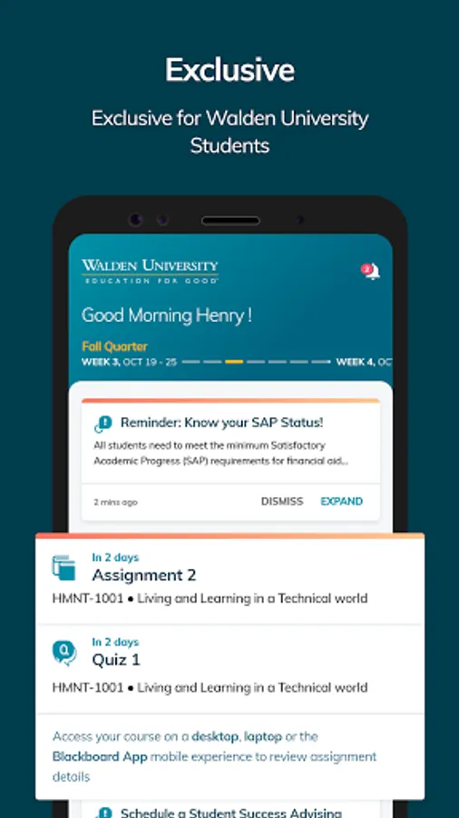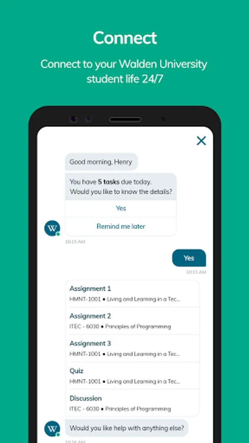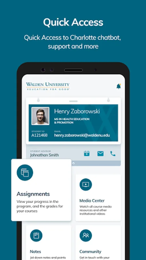 Walden Companion Mobile is a new app designed to help course-based students succeed at Walden University. Digital coach helps you through your to-do list, Walden's Charlotte chatbot is just a click away. Walden Mobile makes it easier to be on the go, keeping track of your courses, assignments, and grades from your phone.