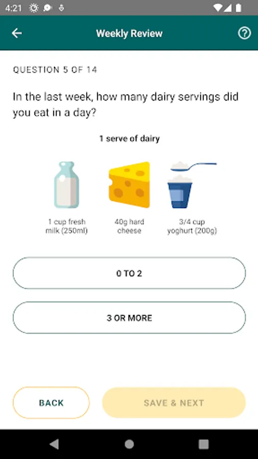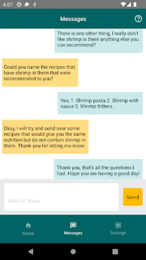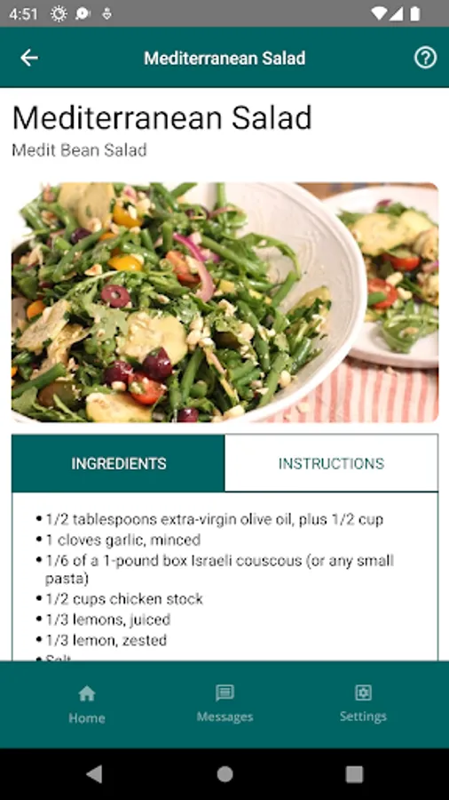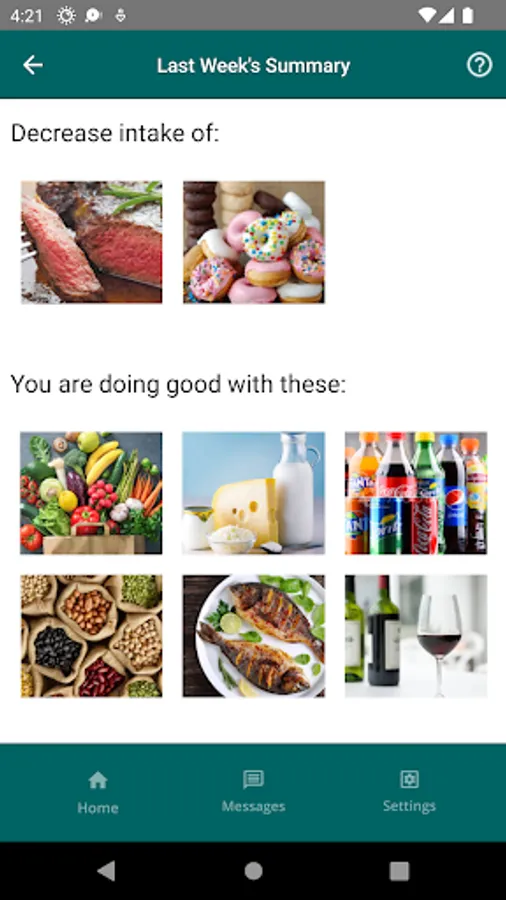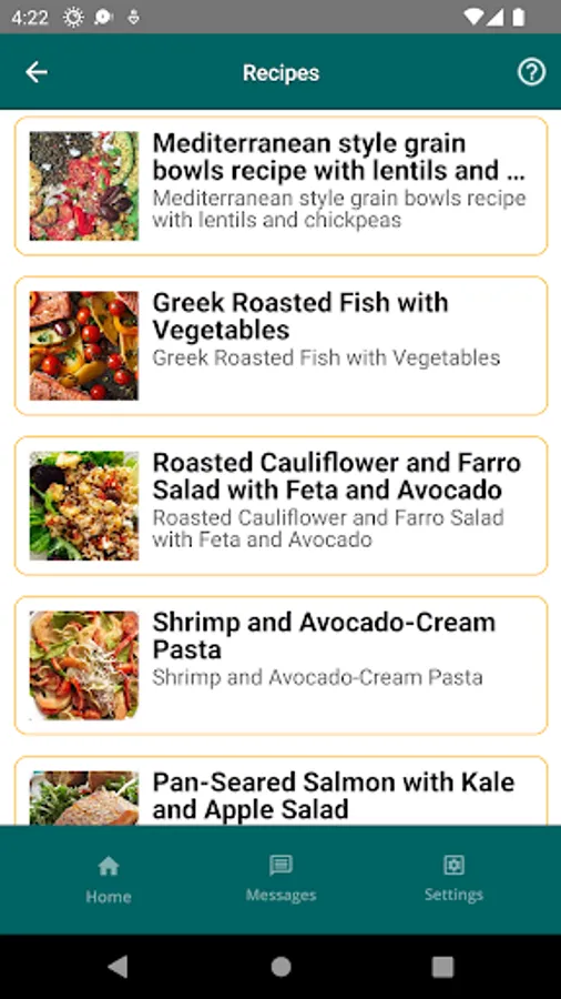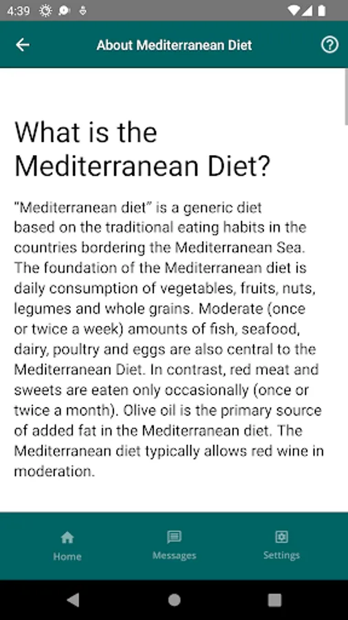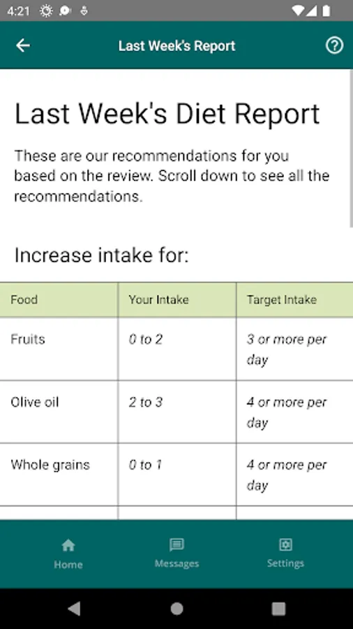 The app allows you to take a short weekly survey about foods and drinks you had in the last week. The app provides a personalized report on areas for improvement and recommends daily recipes for breakfast, lunch, dinner, and snacks based on the responses. The app also has an in-app messaging feature that supports sending and receiving texts. The app also provides information about the Mediterranean Diet and access to an extensive database of healthy recipes.