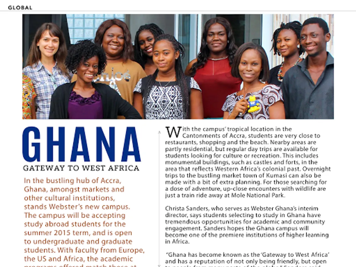 Focused on student life locally and globally, Webster University's student-produced magazine, Ampersand, represents campuses in 4 continents, 8 countries and 60 cities. This one university is dedicated to transforming students for global citizenship and individual excellence.