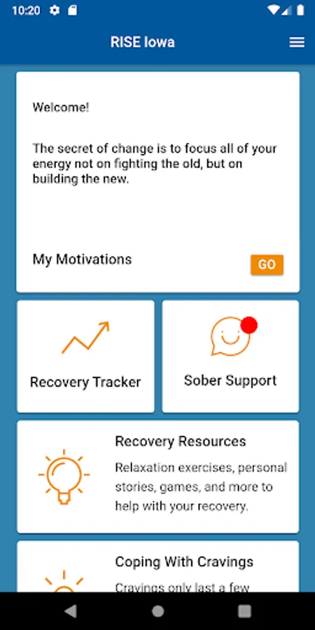 RISE Iowa provides 24/7 sober support to help people stay engaged in their recovery. Features include an online sober support network, articles and information related to recovery and relapse prevention, relaxation and mindfulness exercises, a weekly recovery check-in and recovery tracker, recovery podcasts and personal stories, help coping with cravings, and local resources.