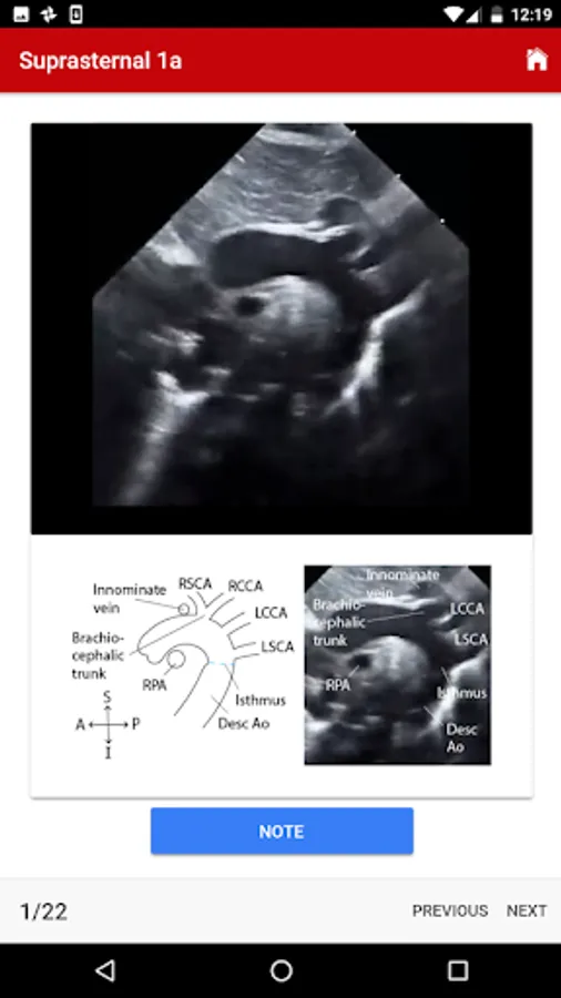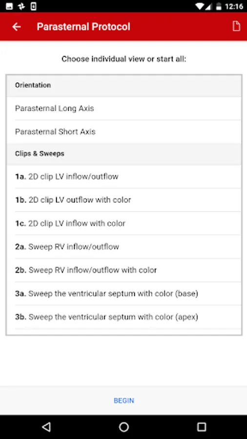 The exact images and the order in which the images and views are obtained varies by institution. Each protocol (subcostal, parasternal, apical or suprasternal) can be followed in order by clicking on the next tab at the bottom of the page or you can click on an individual numbered view within the protocol list to be taken directly to that view. The name of the view and instructions will pop-up automatically at the bottom of the page. The instructions and additional notes can also be found in the “NOTE” button at the bottom of the page.