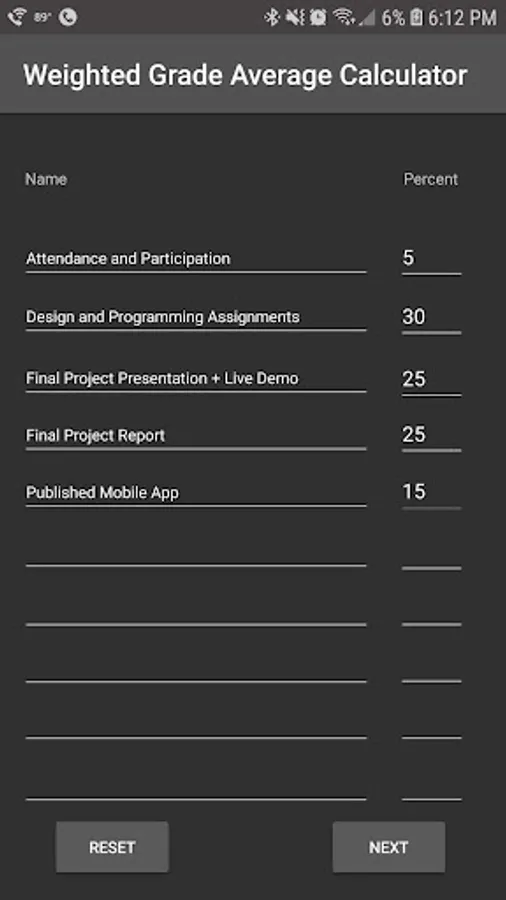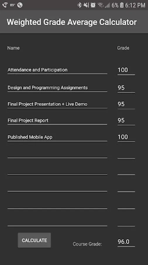 With the above, the app is able to determine average weighted grades based on category scores and then the app would calculate the total grade based on each category grade while taking into account the weight from each category compared to the grade as a whole.