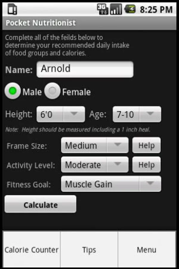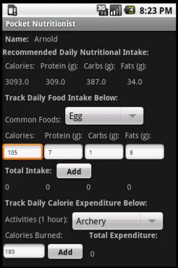 Pocket Nutritionist is a simple to use application that calculates recommended daily calorie, protein, carbohydrate and fat needs based on age, height, frame size, activity level and fitness goals. Pocket Nutritionist also tracks your daily food intake and expenditures with a large library of common foods and activities.