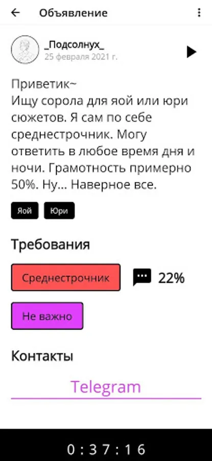 Roler was created for lovers of rp (role play) in chats, so that the search for rp is convenient. After creating an account, you can find hundreds of stories and send your own. Leave comments, like or listen to stories / plots, it is convenient to copy the plot for RP via the button or save and find later. You can create a sorol search ad with multiple parameters (requirements). You can leave an announcement about the role (chat where RP takes place). There is a character generator (questionnaire generator), the generated text can be copied to the device memory.