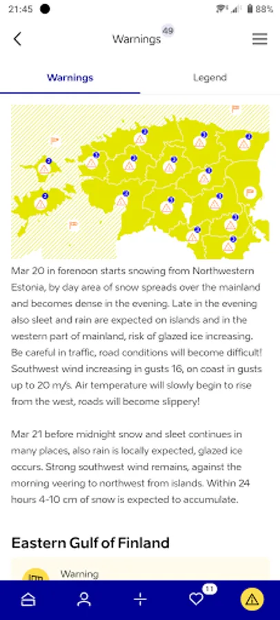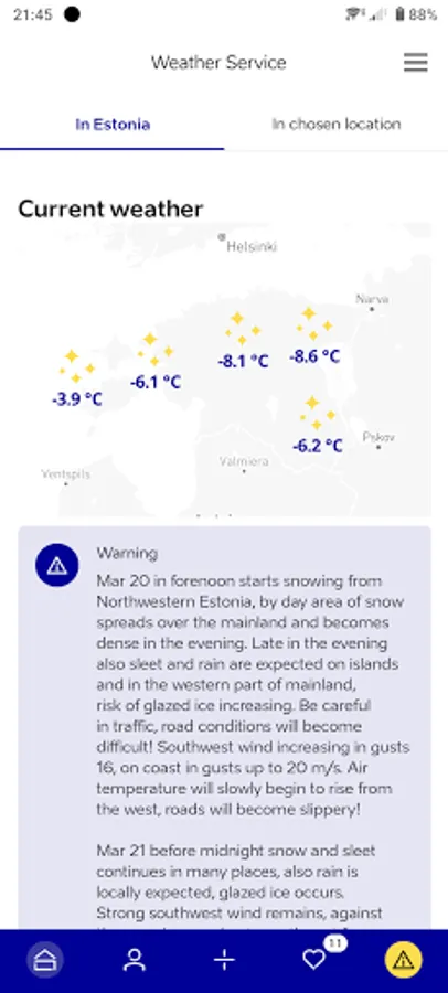 With Estonian Environment Agency’s Weather App You can feel confident. Always be aware of weather warnings at your location. Contribute to ensuring the quality of Estonian weather forecasts and warnings by providing us with information about dangerous weather at your location.