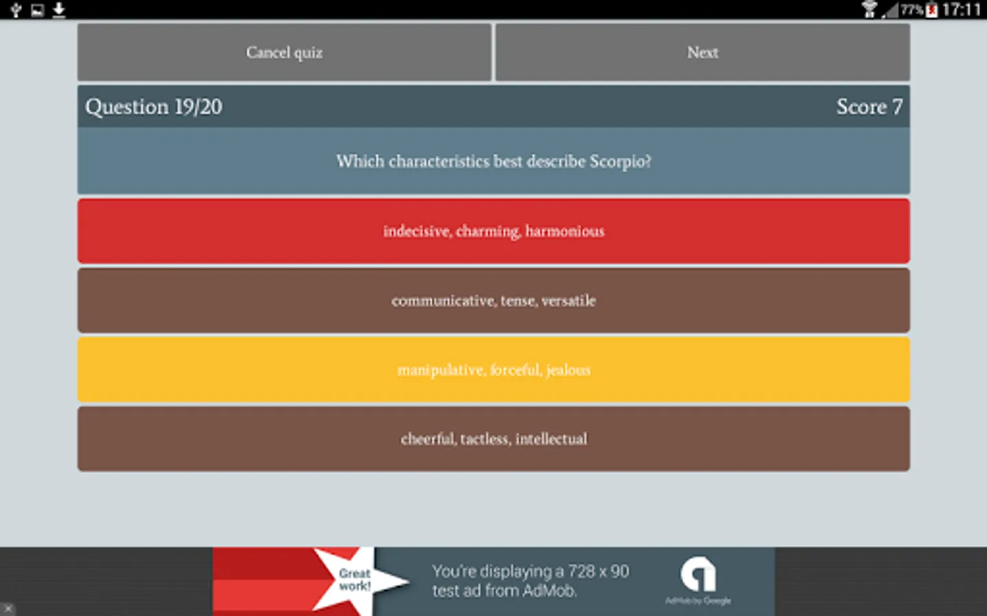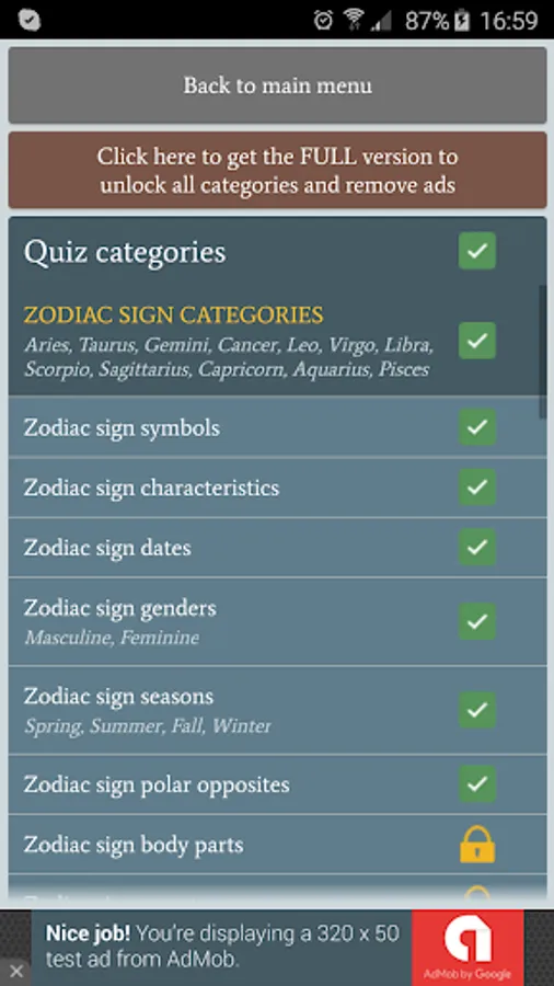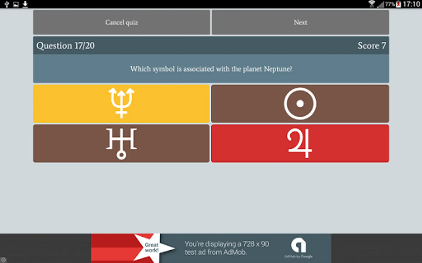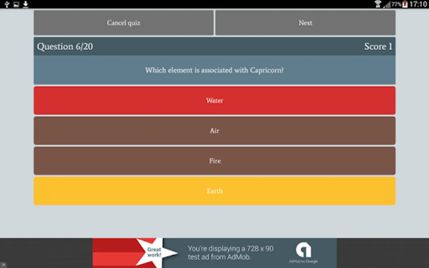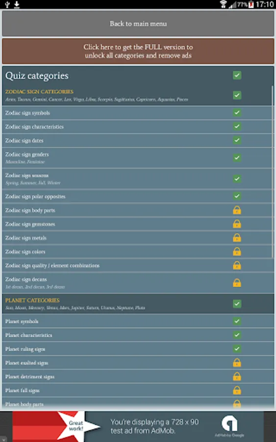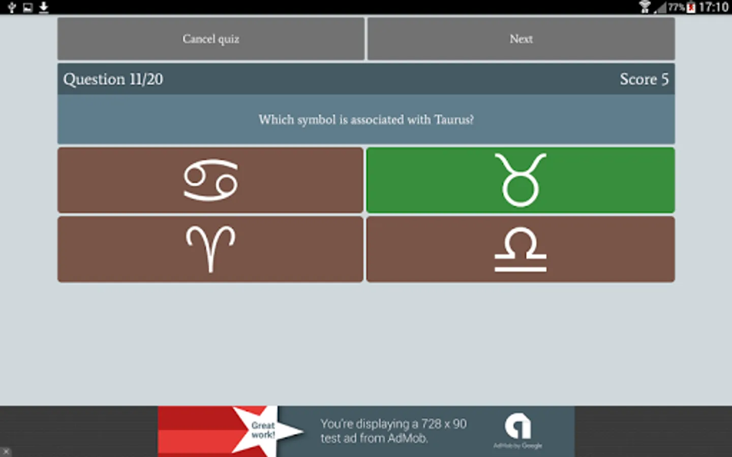 Be sure to check out the ad-free version of Astrology Quiz to unlock all categories: https://play.google.com/store/apps/details?id=ee.arws_apps.astrologyquiz