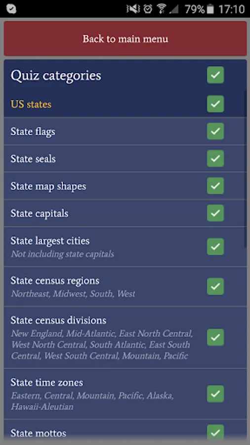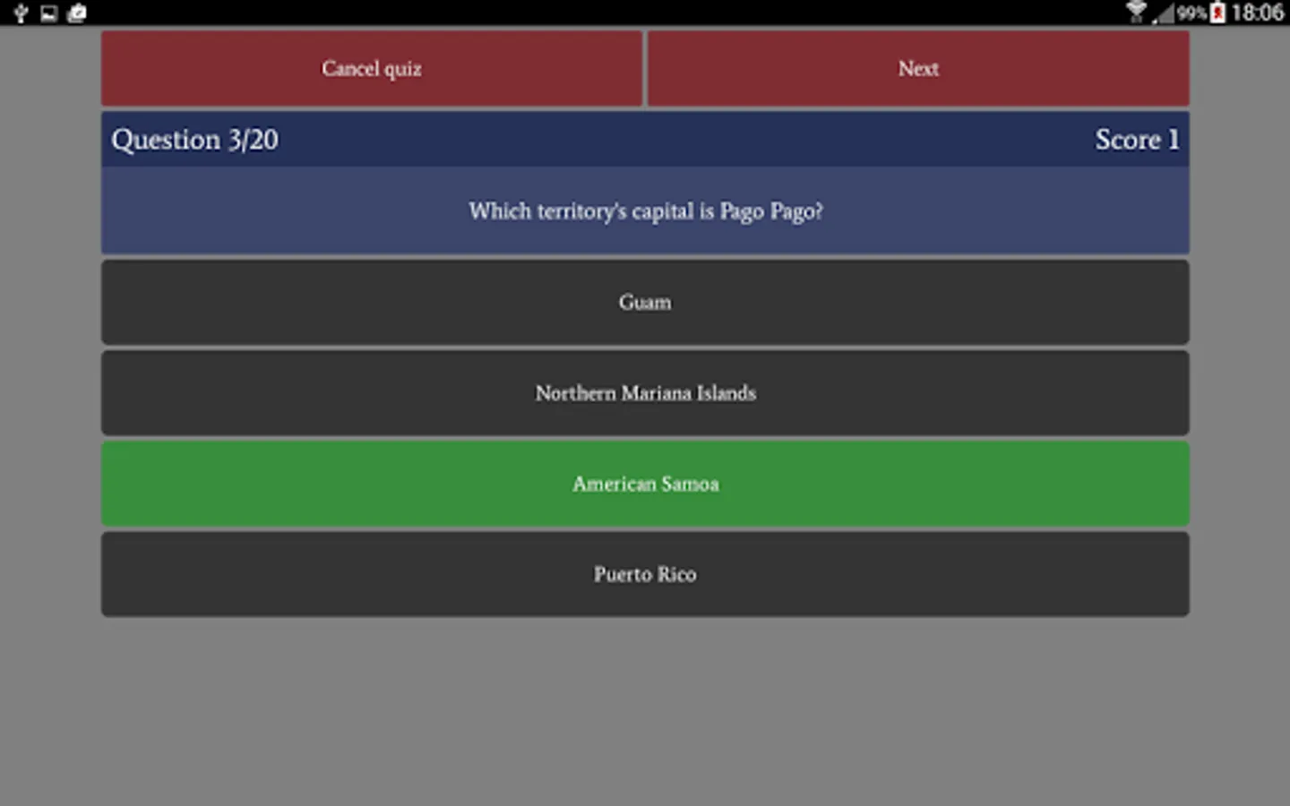 Features questions about 50 states (from Alabama to Wyoming), 5 territories (American Samoa, Guam, Northern Mariana Islands, Puerto Rico, U.S. Virgin Islands) and 1 federal district (Washington D.C.). Includes many question categories which can be combined to focus on specific subjects.