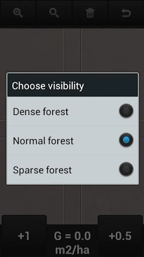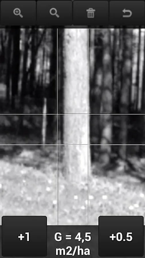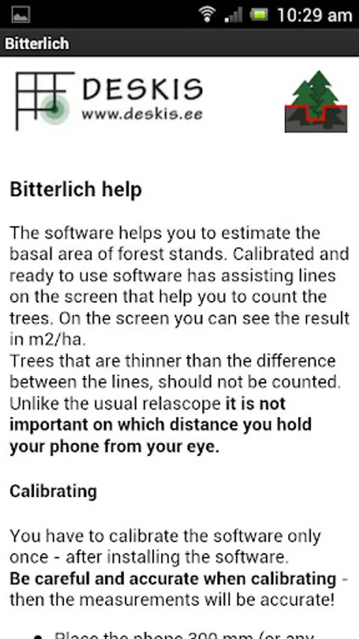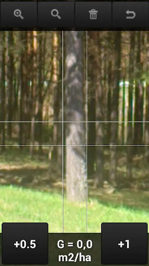 The software helps you to estimate the basal area of forest stands. Unlike the usual relascope it is not important on which distance you hold your phone from your eye. There are assisting lines on the screen that help you to count the trees. On the screen you can see the result in m2/ha. Trees, which are thicker than the difference between the lines should be counted as +1 and trees that are exactly the lines between should read +0.5