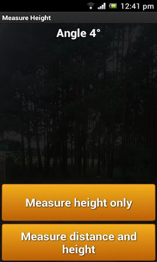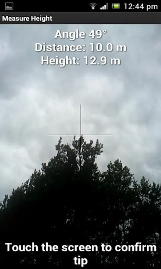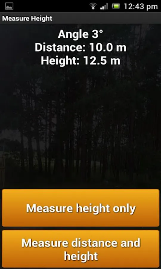 Software uses devices accelerometer and trigonometrical equations to estimate distance to a tree and tree height. When measuring the height you can choose whether you already know distance to the tree or the distance should be measured with this software. Note that measured height value will be more accurate when you insert exact value of distance. Software has assisting cross on the screen, that helps you to measure tree base and tree tip.