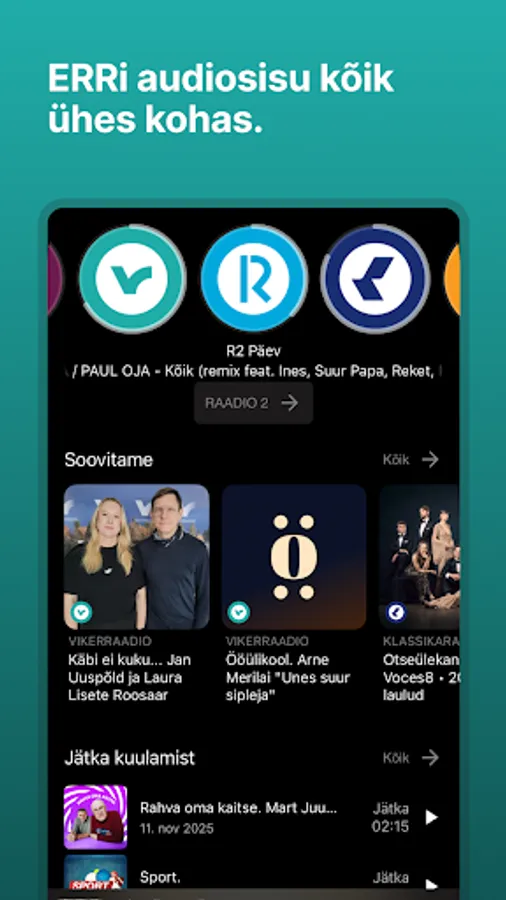 Muu hulgas leiad äpist Vikerraadio, Raadio 2, Klassikaraadio Raadio Tallinn, Raadio 4, veebiraadiod, ERR-i podcastid, valiku telesaateid.