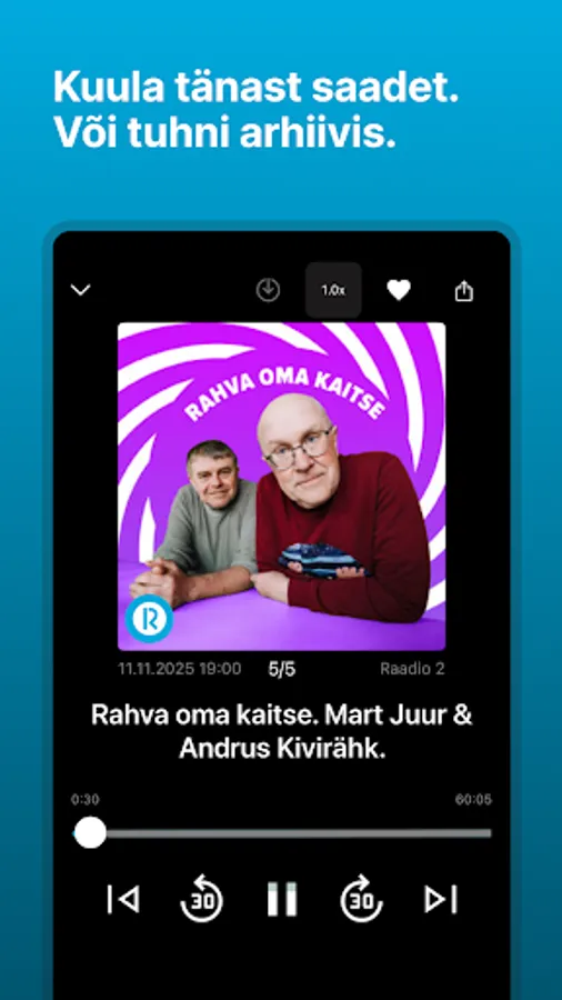 Eesti Raadio sisu saab kuulata otse ja järele ning jätkata kuulamist sealt, kus saade viimati pooleli jäi. Offline'is kuulamiseks lae saade alla, et hea sisu endaga kaasa võtta kasvõi lennukisse. Kõiki saateid saab kerida edasi ja tagasi, samuti liikuda raadiosarjade erinevate osade vahel.