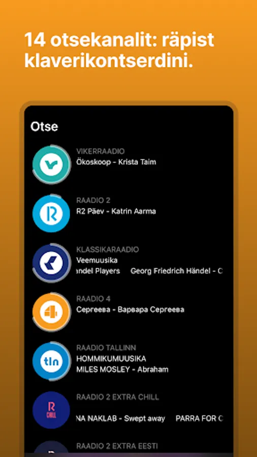 Eesti Raadio koondab mugavalt ühte kokku Eesti Rahvusringhäälingu kõik raadiojaamad - Vikerraadio, Raadio 2, Klassikaraadio, Raadio Tallinna ja Raadio 4. Väärt sisu leiab iga kuulaja, kontserdiülekannetest populaarsete raadiosaadete ja kuuldemängudeni.