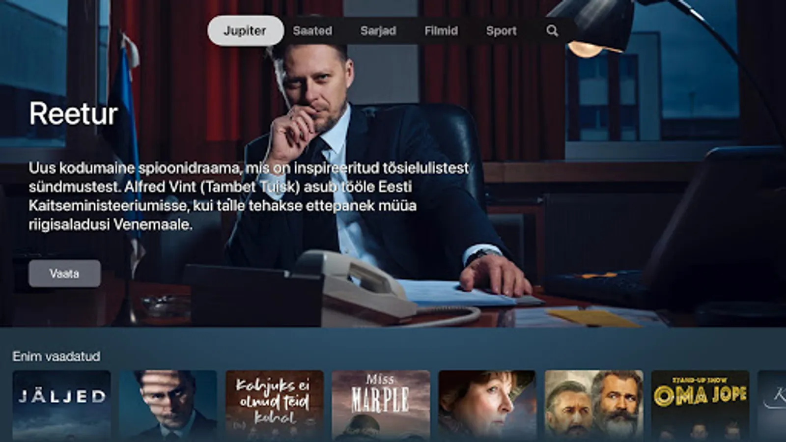 Jupiter is a new program of Estonian Public Broadcasting. At the same time, the Jupiter web channel is the world's largest Estonian-language Free Video On Demand (FVOD), bringing together the best radio and TV programs produced in ERR, spicing it up with a high-quality foreign procurement program and offering convenient ERR radio and TV channel viewing. Jupiter was born on April 22, 2020, and together with its sister child Children's Screen, it has quickly become a favorite of listeners and viewers. Stream visitors spend more than three hours a week in Jupiter. The strength of Jupiter can be considered to be the availability of serials regardless of time and place, seasonally, in a visually enjoyable environment. Jupiter also offers additional opportunities for ERR's traditional linear channels, but also for young people - many of whom do not have access to traditional electronic media devices such as television or radio.