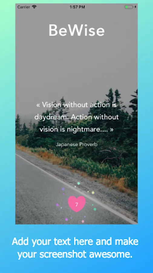 Every morning you will receive a smart advice related to productivity, well-being and lifestyle that will help you to strive among people. BeWise will help you to set your life goals, to motivate yourself and we hope, achieve new goals!