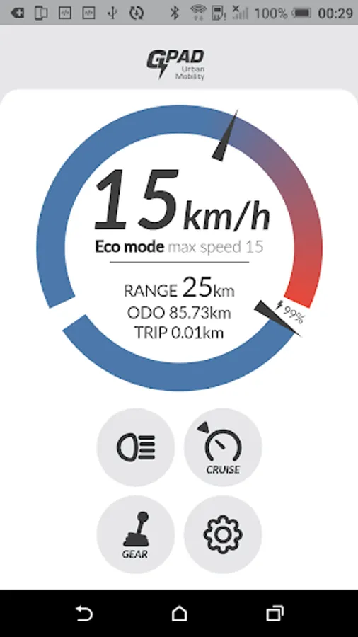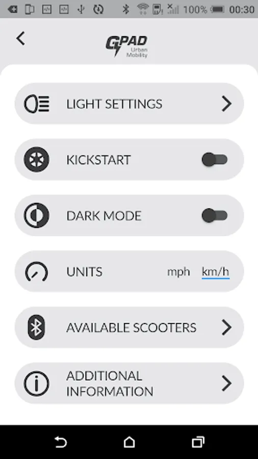 Fiddling with confusing LCD displays on scooters is a thing of the past. Our GPad Svan and GPad Svan Max can be configured with this intuitive and straightforward app. Just connect your scooter via Bluetooth and you gain access to: