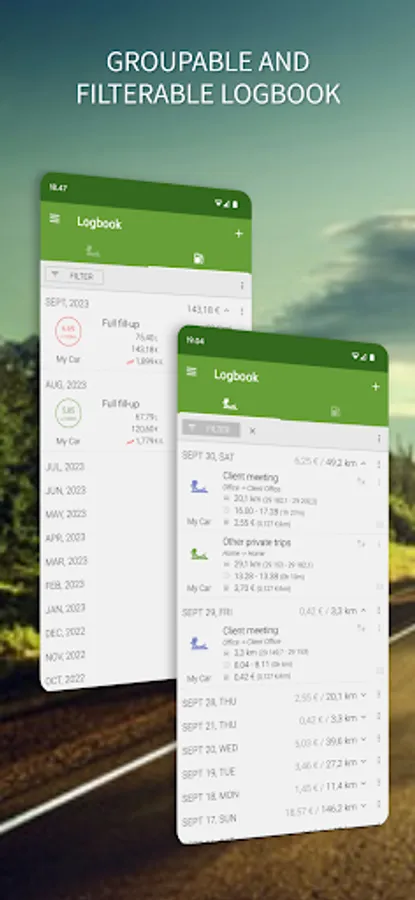 * Filterable logbook: Filter by vehicle, trip type, trip reason or by predefined/manually defined trip periods.
