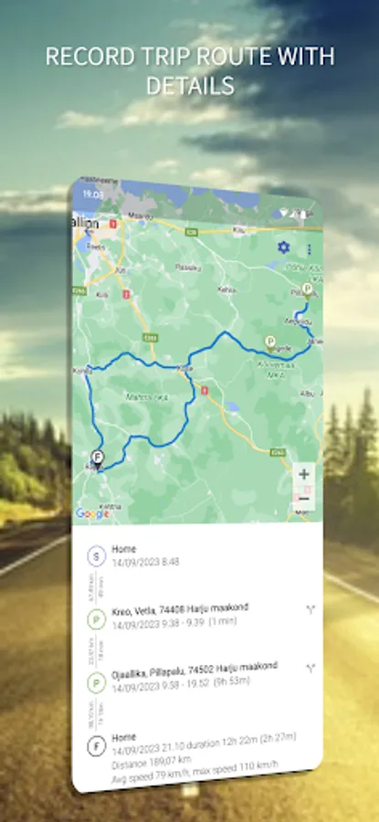* Create trips using GPS tracking. App automatically determines trip distance, travel time, start and end addresses.