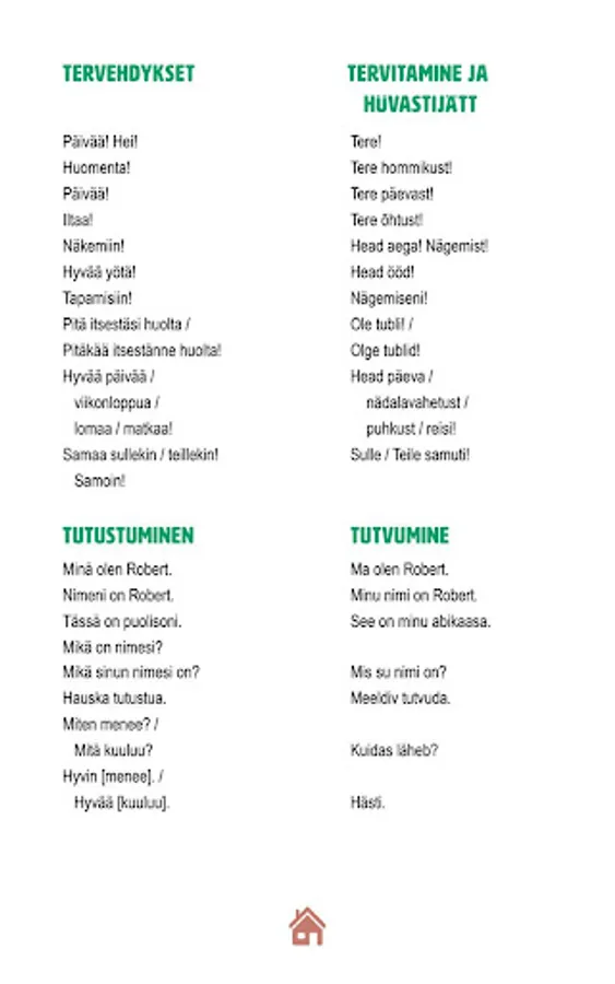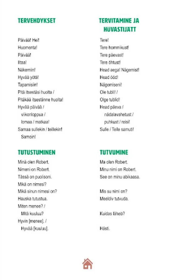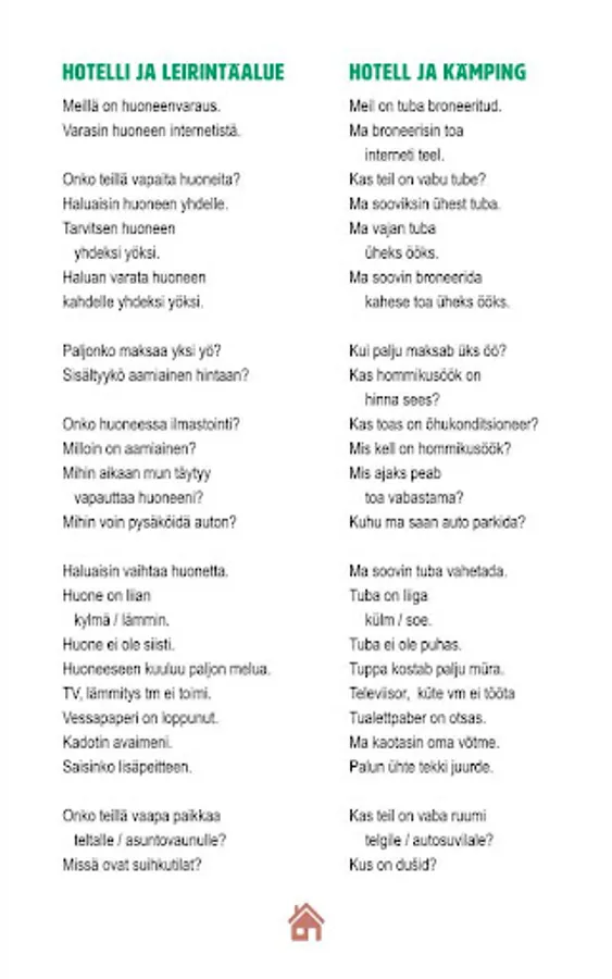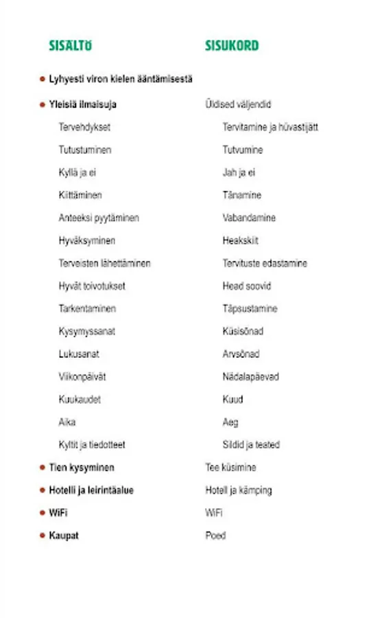 Keskustelusanakirjaan is koottu tarpeellisia sentences and ilmaisuja Finna and viroksi, joiden avulla mahdollista have come ymmärretyksi sekä ilmaista itseään different paikoissa and tilanteissa.