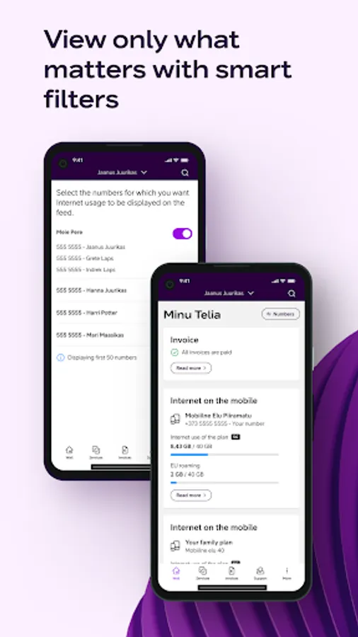 The Minu Telia app is a compact mobile self-service for Telia customers. It offers a convenient way to keep track of your internet usage, running costs and invoices.