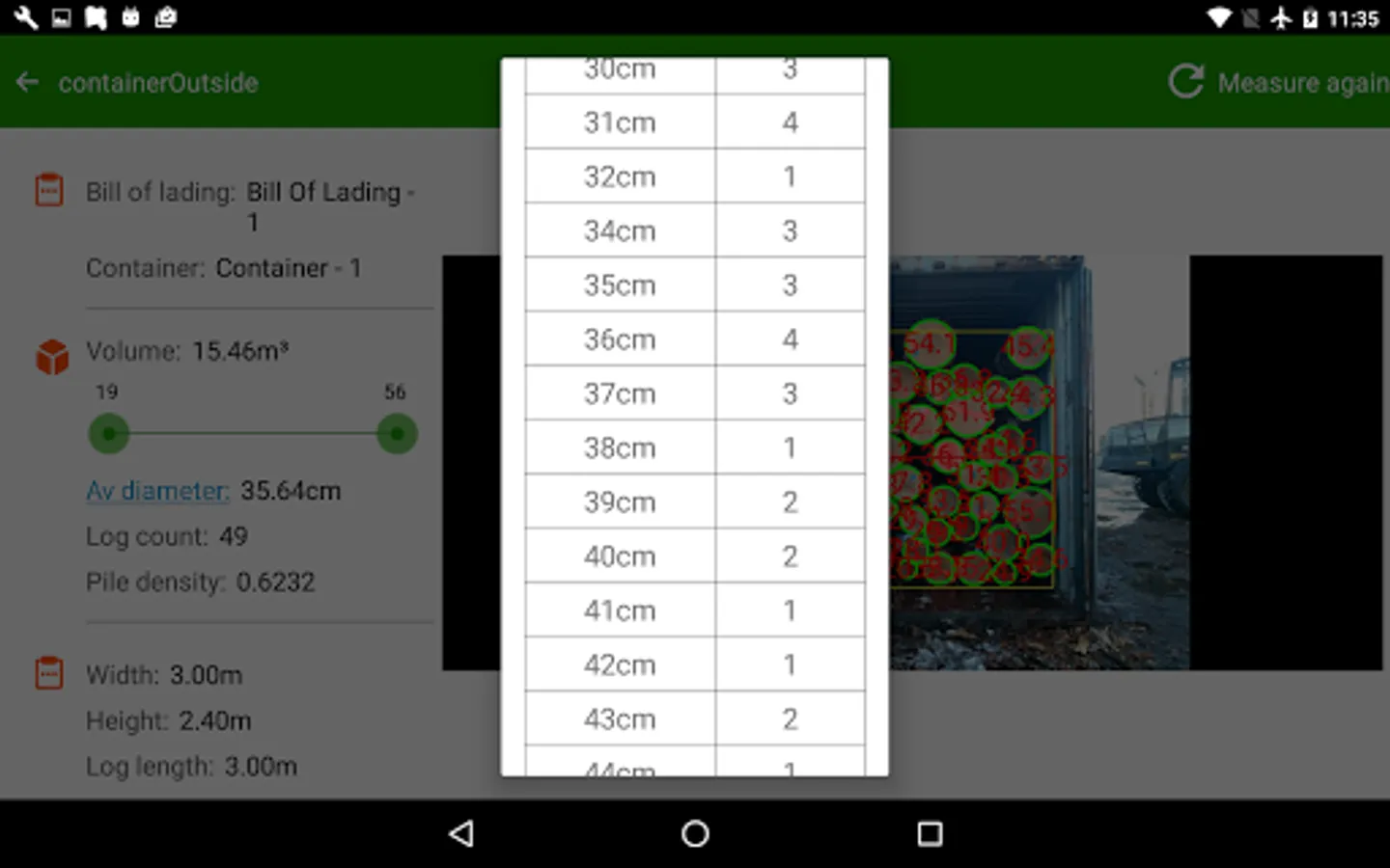 – Detailed distribution of diameters/measurement report download in Excel by Container in our Web platform