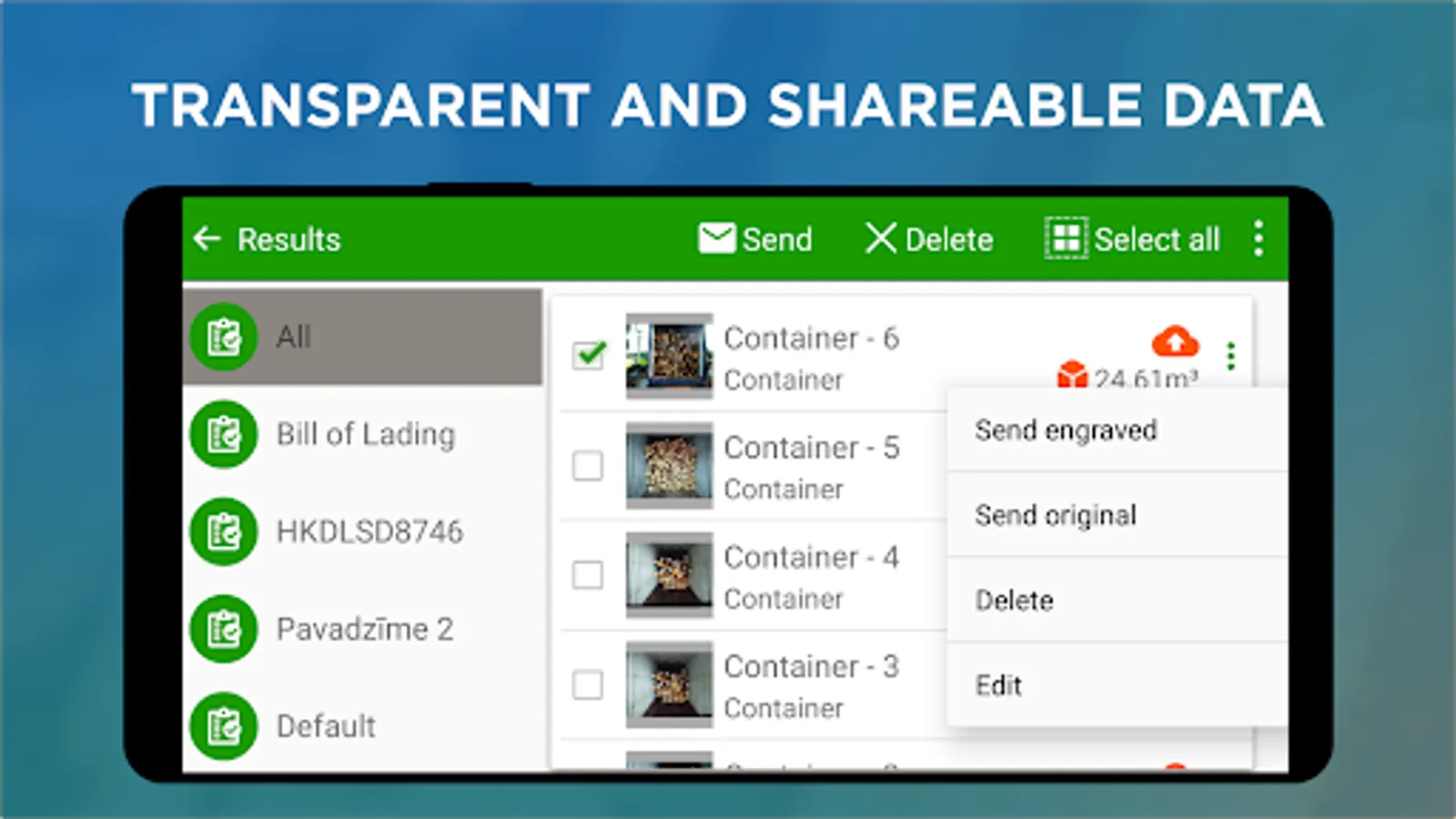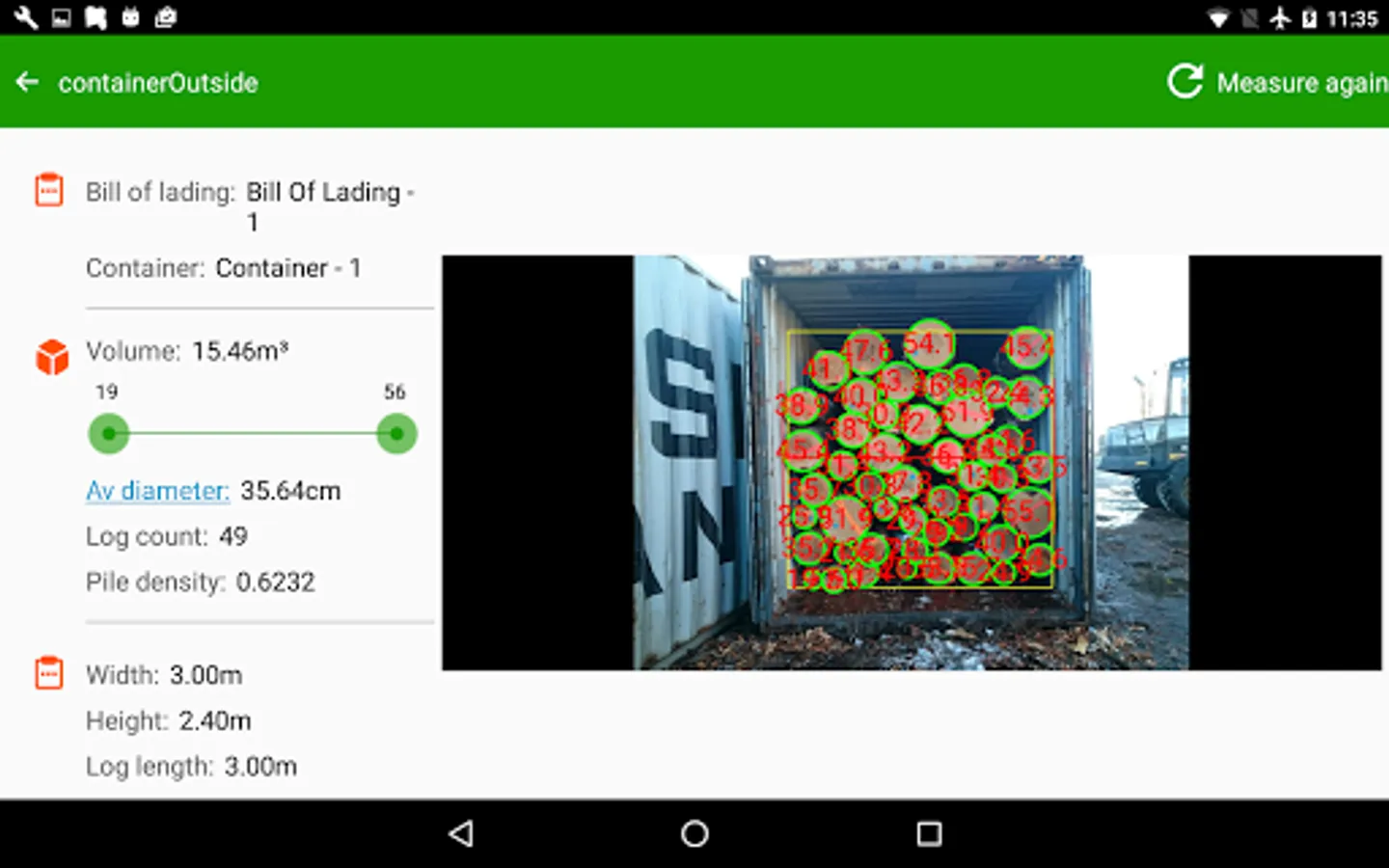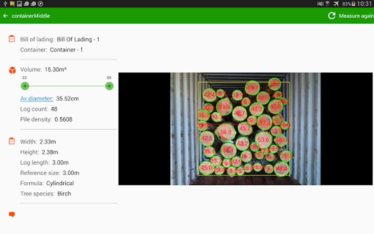 Download Timbeter Container for smartphone or tablet, take a photo of the timber in a container. Timbeter determines the number of logs, volume and diameter of each log. Every pile has is geotagged that makes tracking the timber’s origins easier.