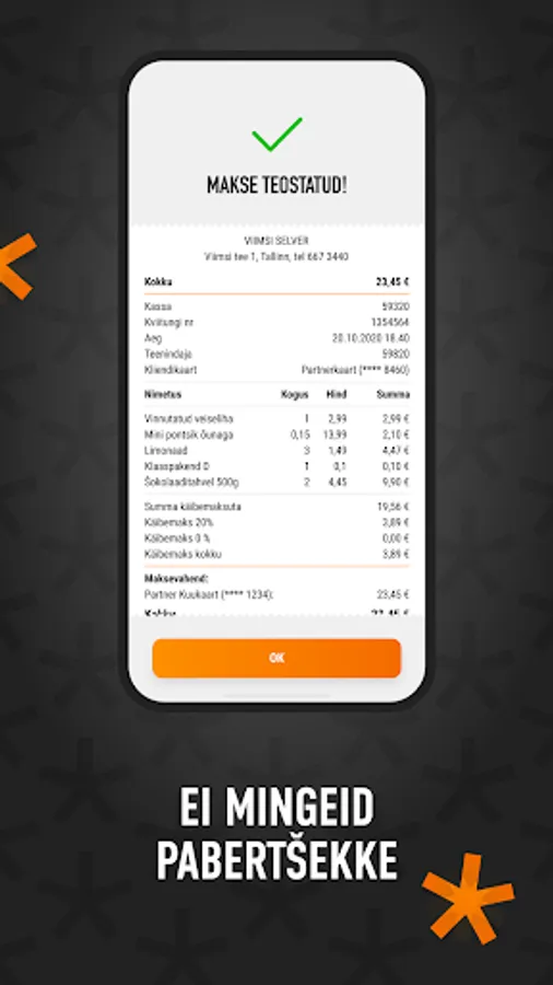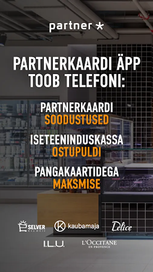 Your smartphone is now connected to shopping console, Partner card and wallet. Partner card App allows contactless shopping in Selver, Delice, Kaubamaja, I.L.U. and L'Occitane shops.