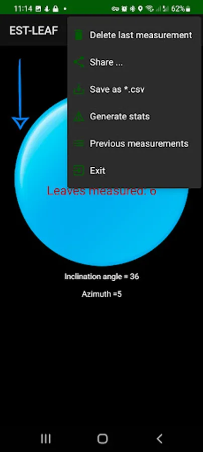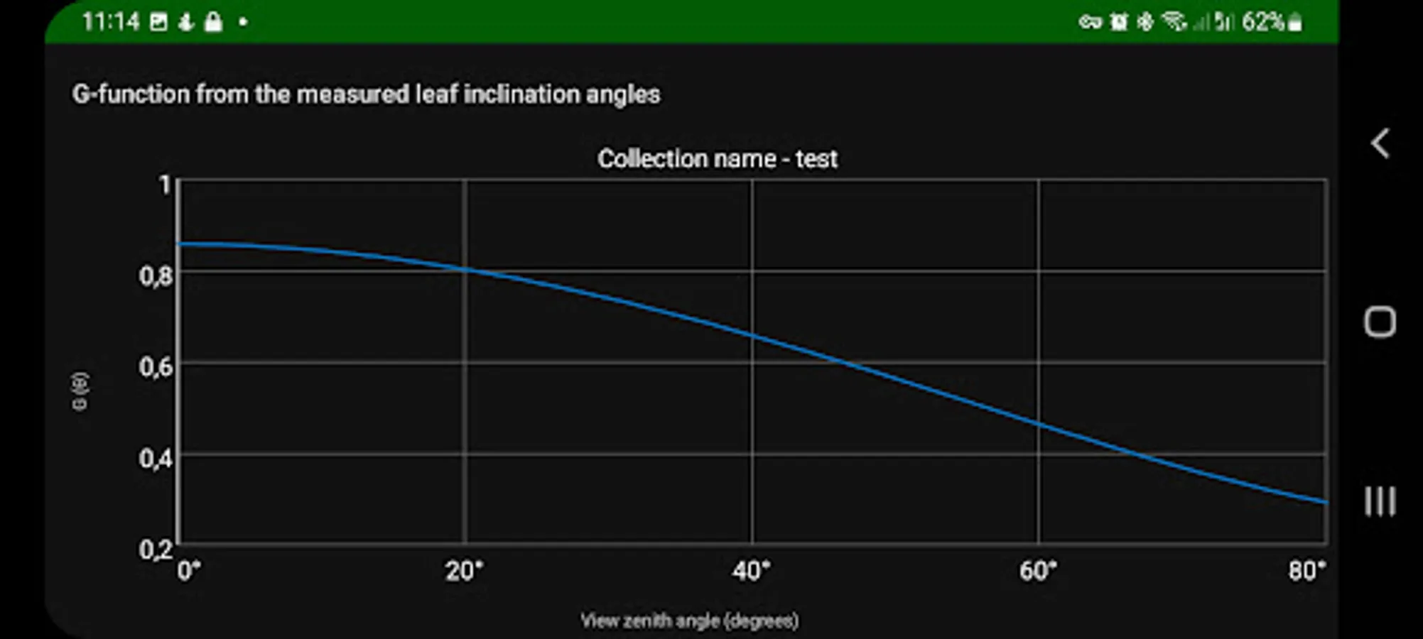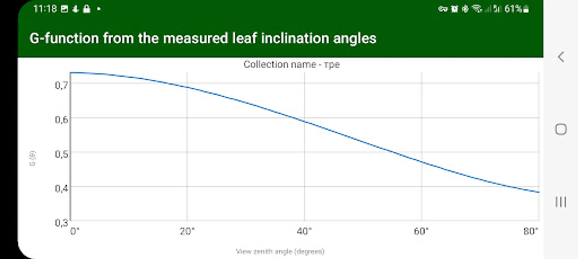 Leaf inclination angles are measured using the phone placement. Relevant leaf inclination angle distribution parameters (mean, standard deviation, beta, Campbell, G-function, deWit type) are estimated. Measurements, results can be stored and exported.