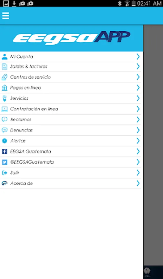 Some of the services available in this application are: balance inquiry, online procurement, requirements and forms, location EEGSA Service Centers and more. If you register your account, you'll receive notices ranging from issuing your invoice, payment receipt or payment of your bill reconnection to notices of suspension of service for maintenance and others.