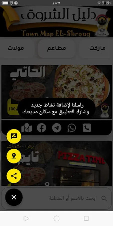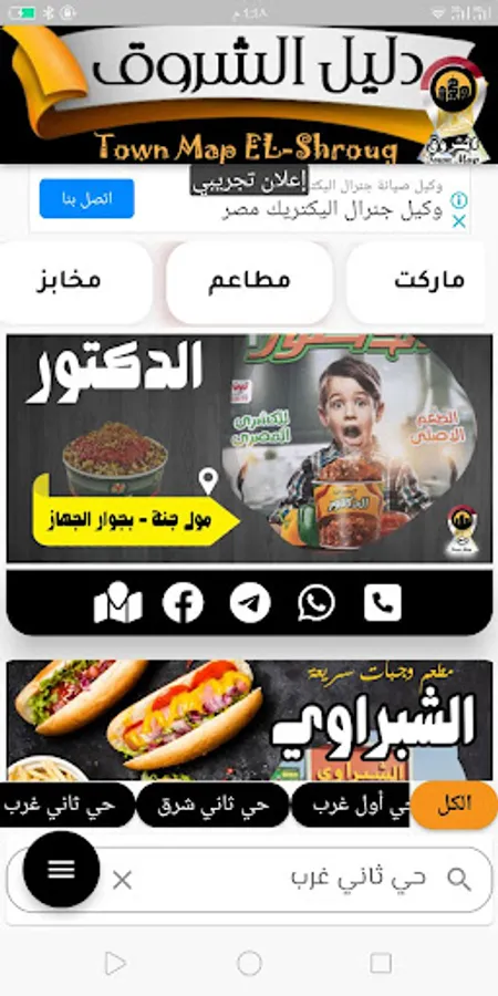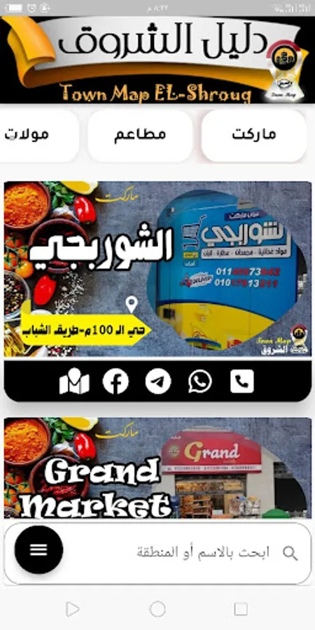 The application of the Sunrise Guide (Town Map EL-Shrouq) enables you to communicate with the city's shops and its various services, via phone call, WhatsApp, Telegram, Facebook .. and access to the location on the map.