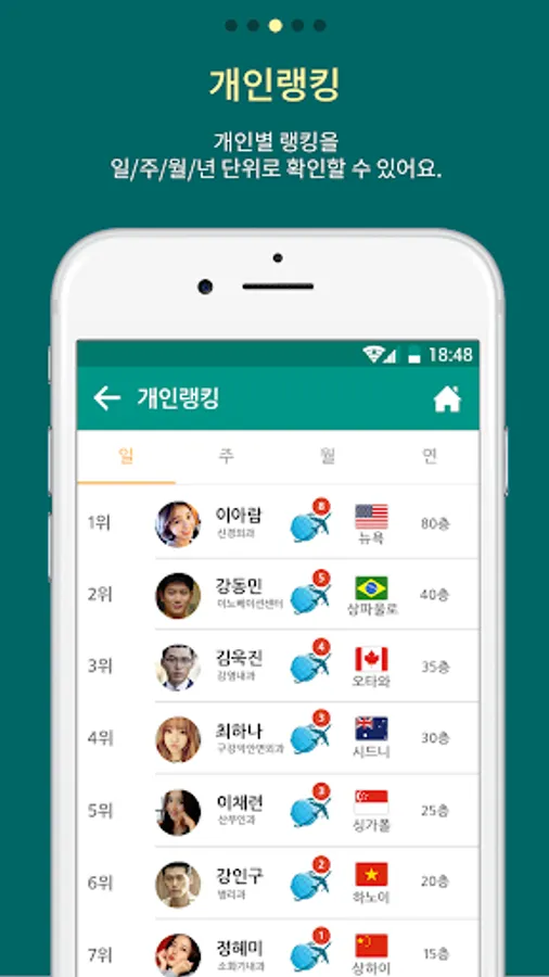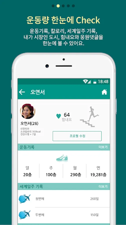 Functions such as daily/weekly/monthly/yearly number of floors, ranking of floors by city, my location city and country, achievement rate around the world, and finding friends are provided so that users can enjoy competing with other users while tracking their healthy lifestyle. can.