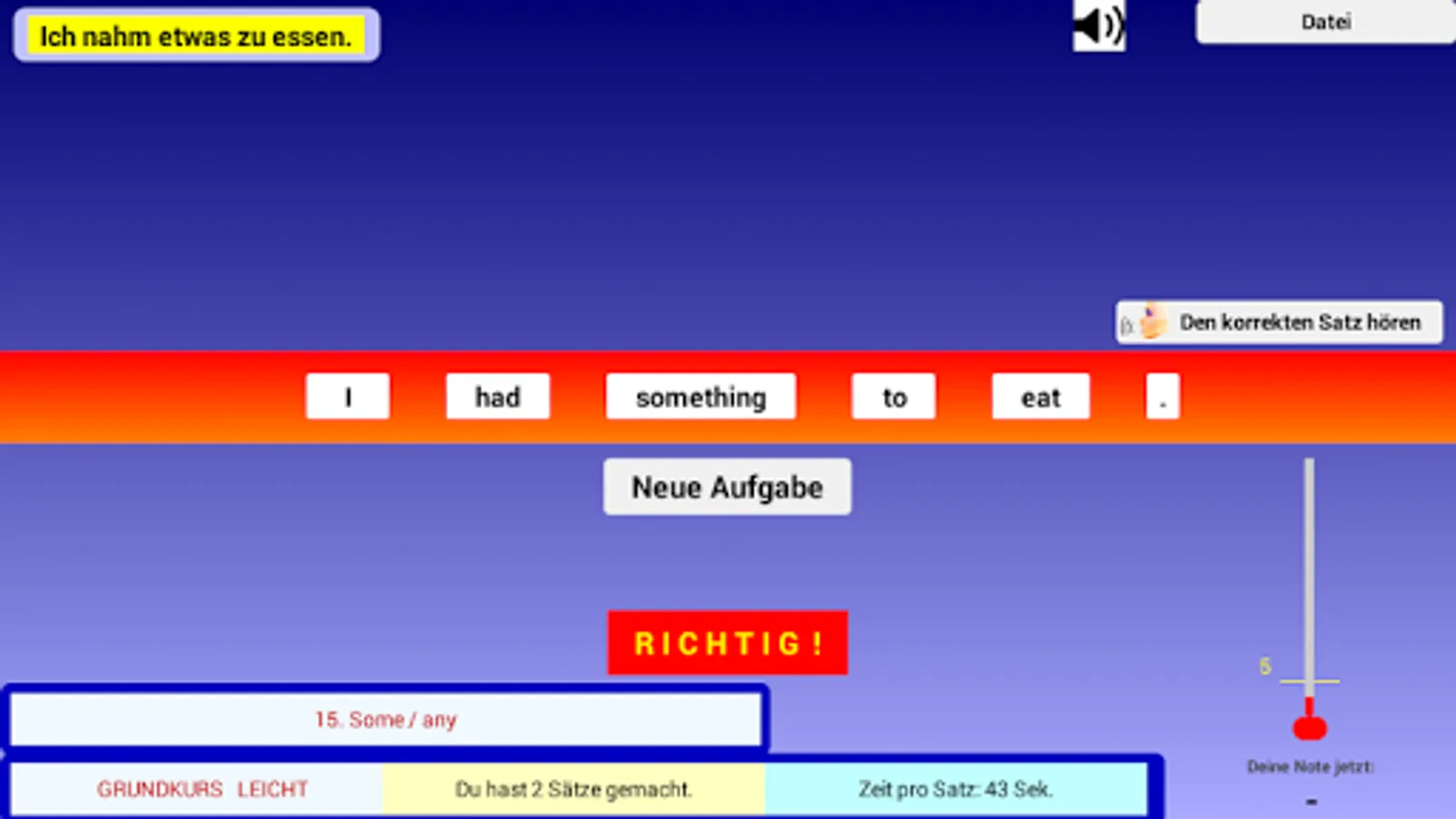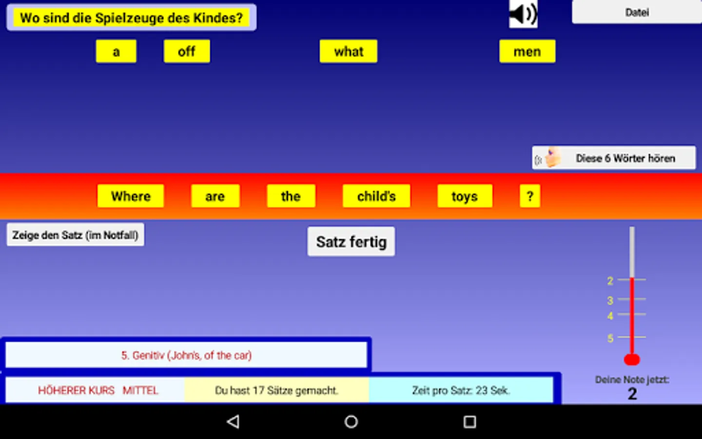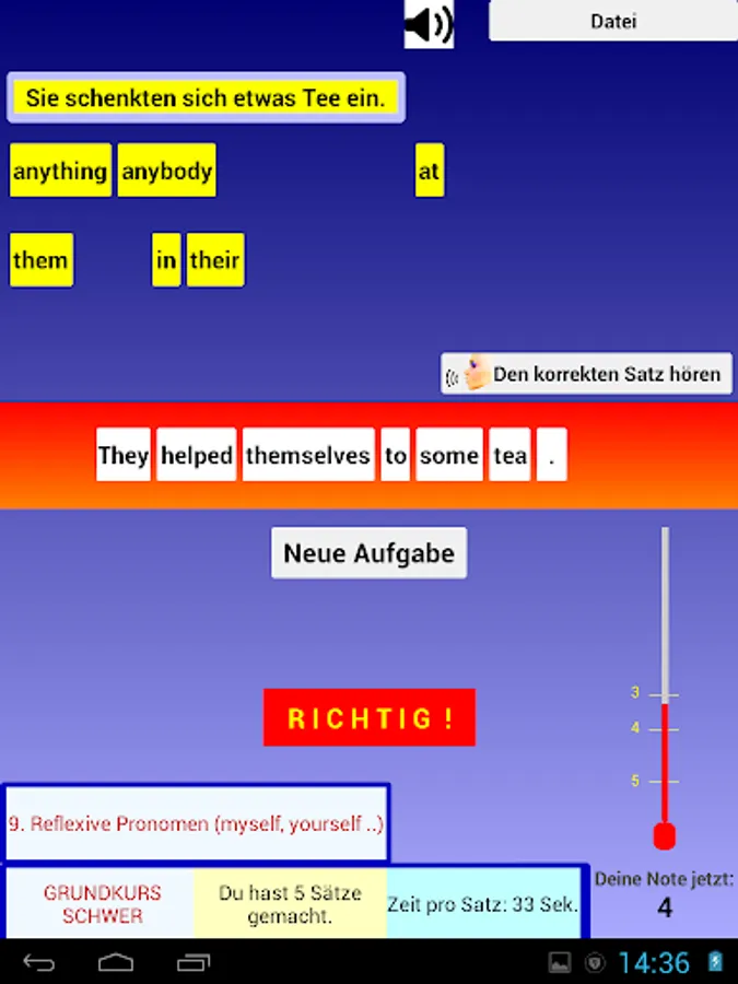 Structured exercises with 7 different levels for beginners as well as university students. The full version has 46 English exercises with more than 2000 practice sentences. This free version only has 25% of the exercises.