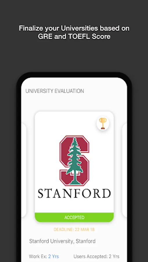 The app provides a profile evaluator which helps in finding the right universities based on your profile and dividing the universities into ambitious , moderate and safe.