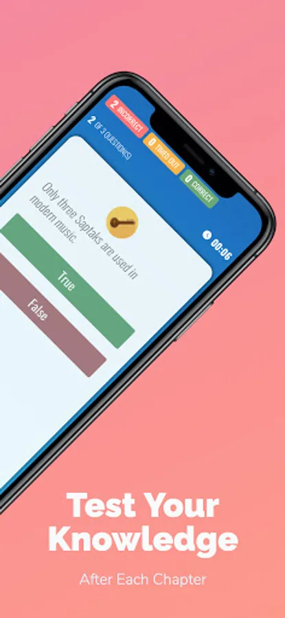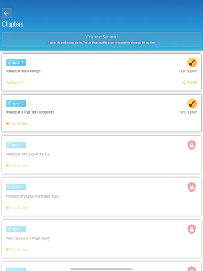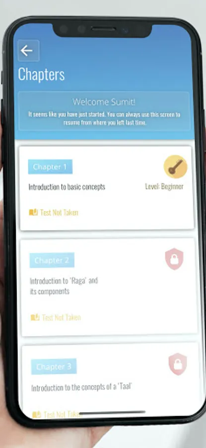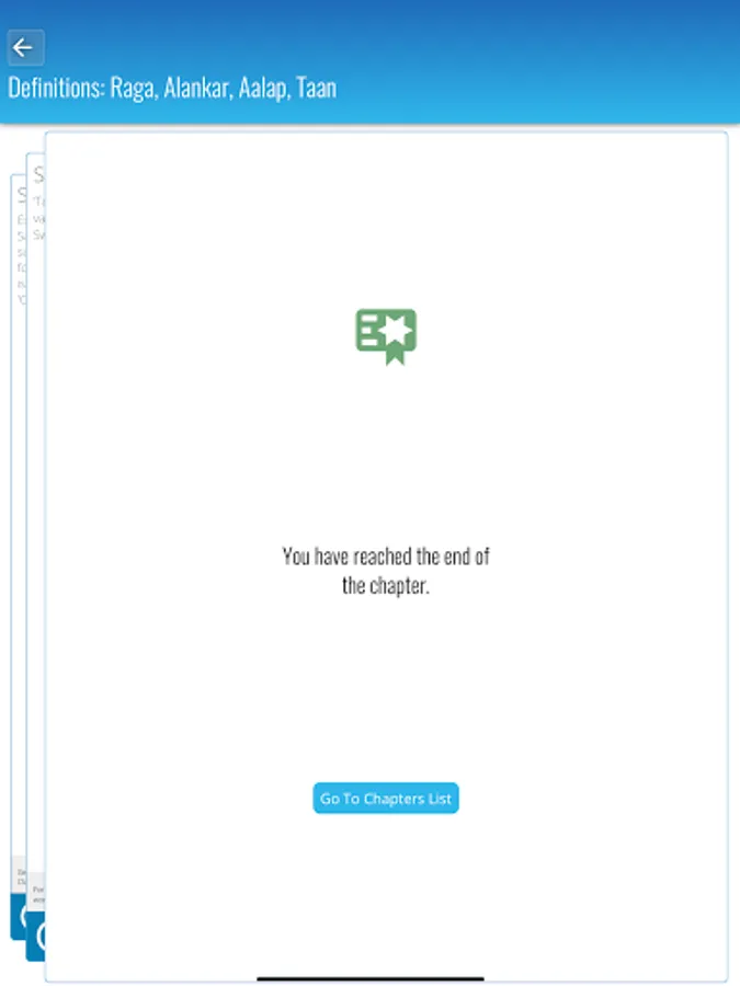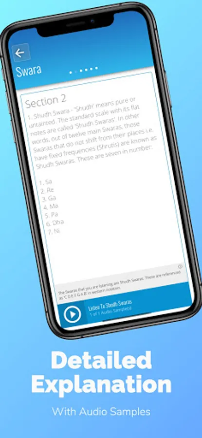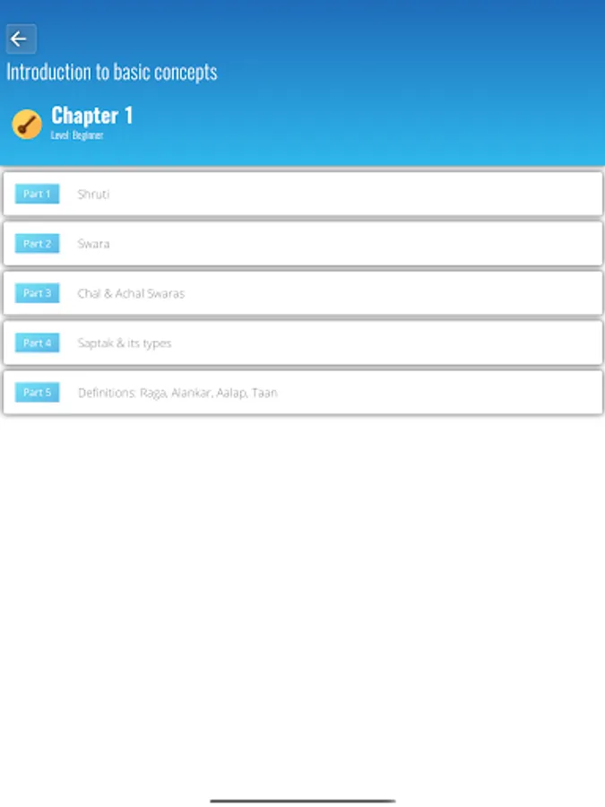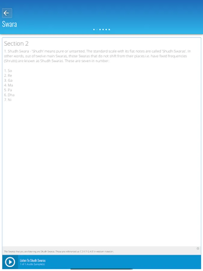 The app is divided into 10 chapters. Each chapter comprises of written content accompanied by musical samples (sung by the developer himself) and sometimes images for illustrations. These chapters are scattered through 3 levels: Beginner, Intermediate and Advanced. Each level ends with an introduction to 5 different Ragas.