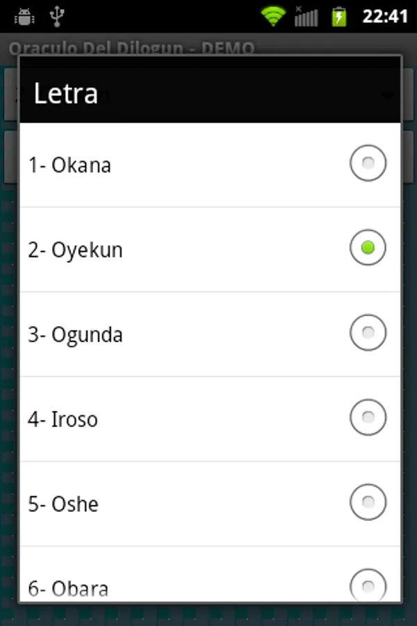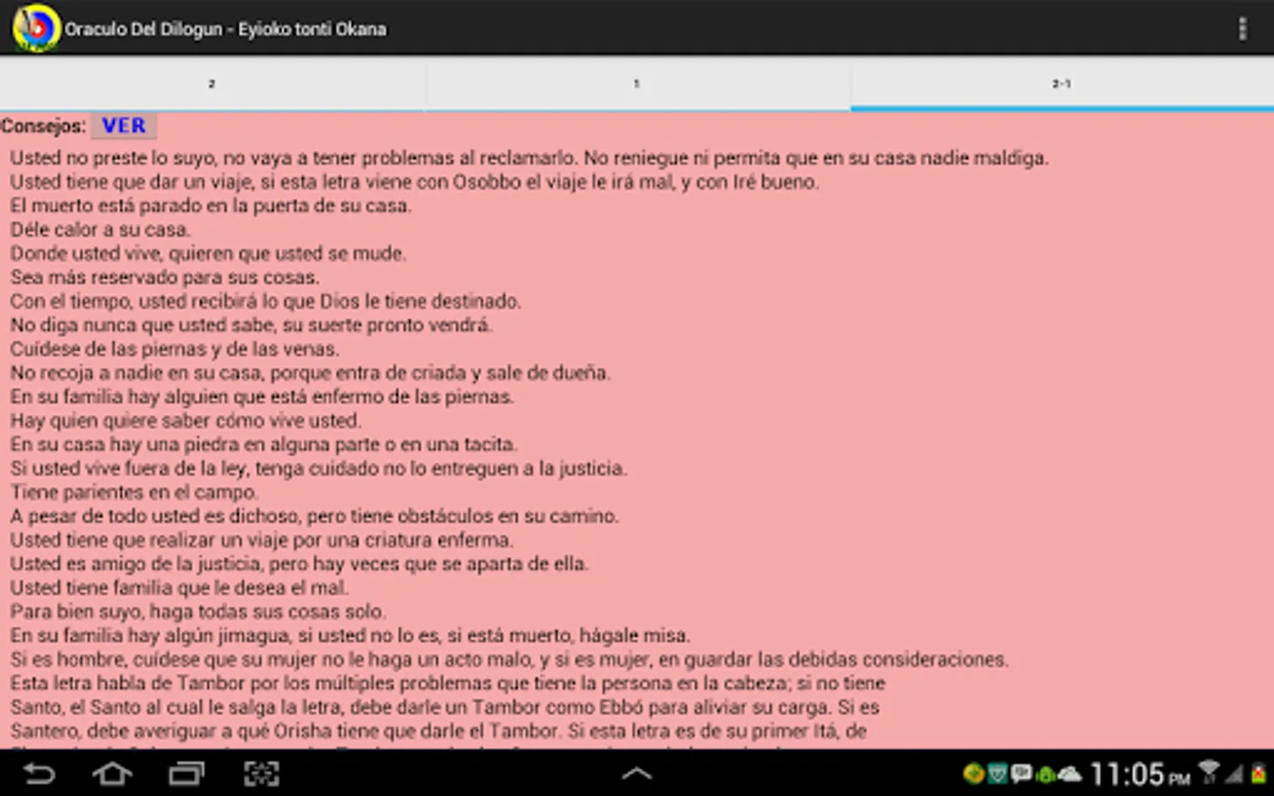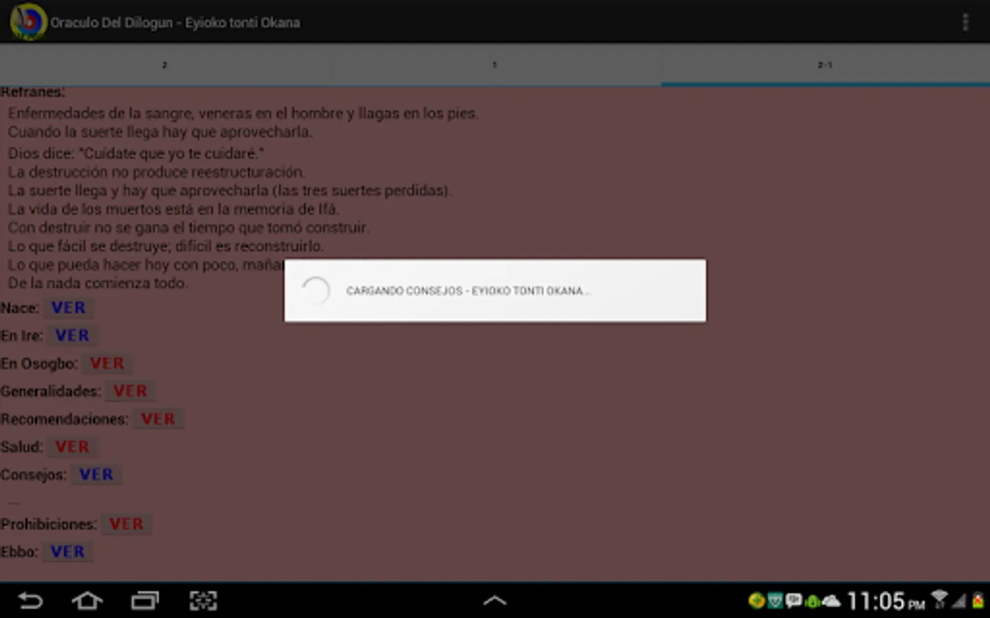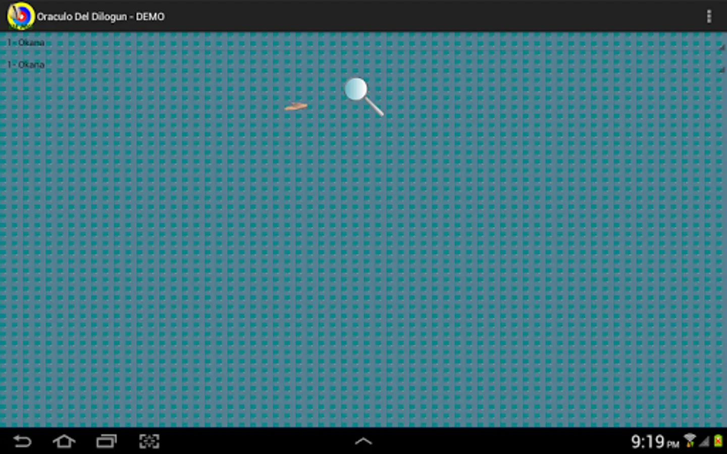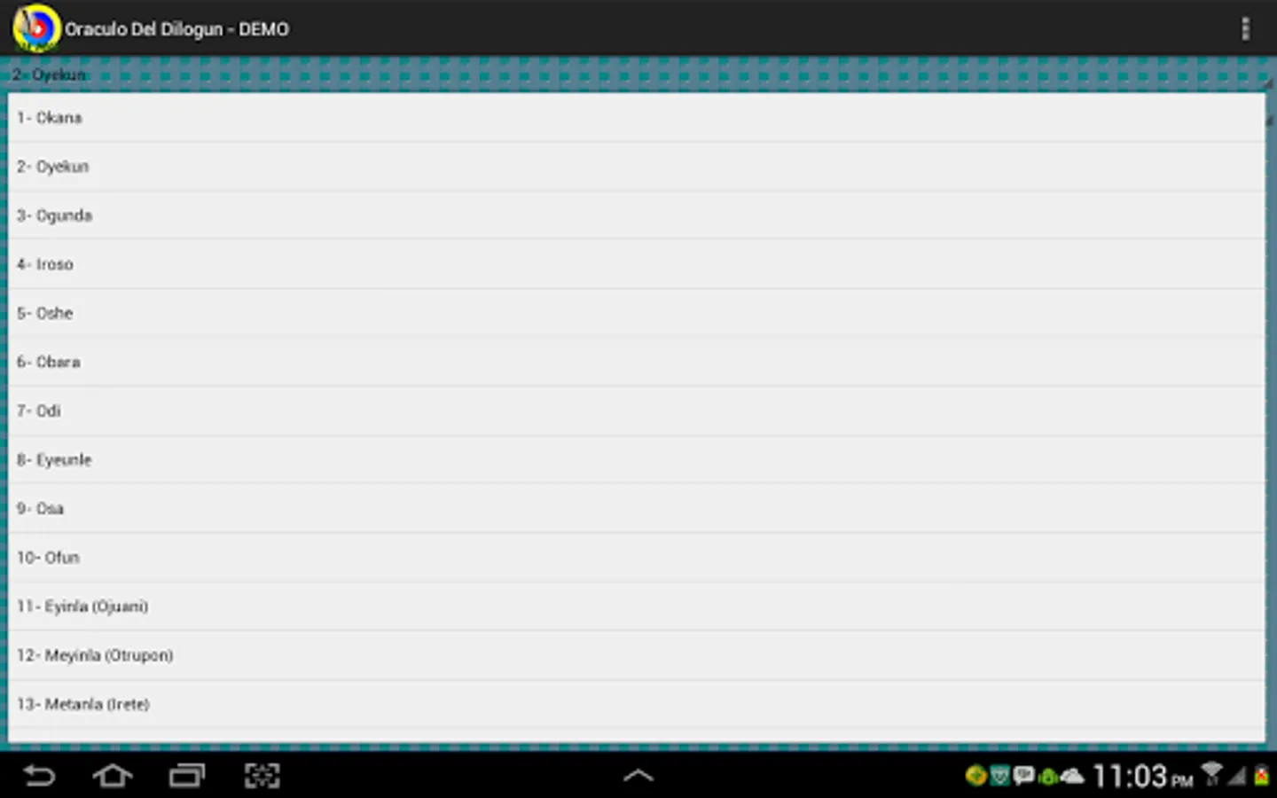 Oracle of Dilogun, this demo aplication allows to Santeros (Iworos) learn about the letras (letters) of the Regla de Osha, their ebboces, recommendations, various aspects (positive, negative, etc ...) and their secrets. In the quest to rescue the Dilogun because today many Italeros speak while are "interpreting" Ifa's Oddun, completely forgetting the meaning of Ocha and proper analysis of the Regla de Osha's letras, and how important they are, we need to rescue and value the Regla de Osha and the good caracoleros.