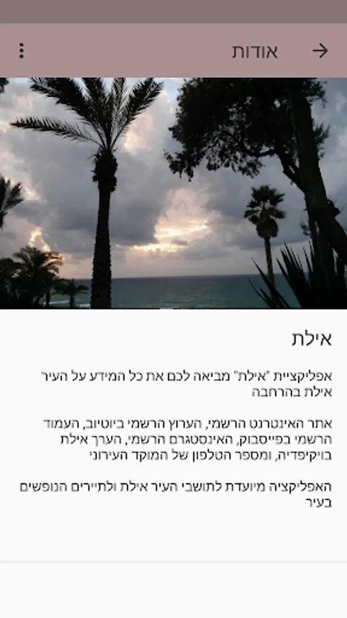 The app includes: official website, the official channel on YouTube, the official page on Facebook, Instagram official, the Eilat Wikipedia, and phone number of the urban focus. The app is intended for residents of Eilat and tourists vacationing in the city.