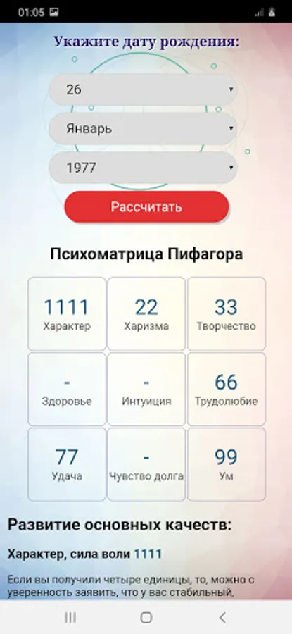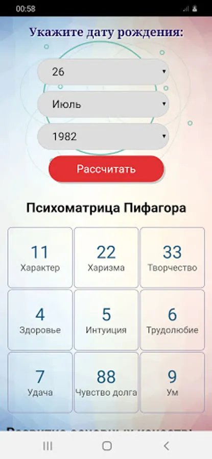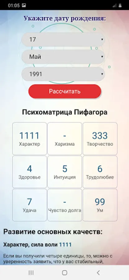 "Pythagoras Square", or in other words "Pythagoras Psychomatrix", will help to calculate character traits and hidden talents by date of birth.
