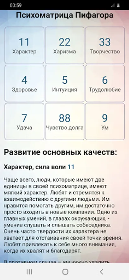”Thus, the Pythagorean square is a unique analytical tool that provides unique opportunities for numerology and allows a multifaceted assessment of the personal characteristics of any person. “