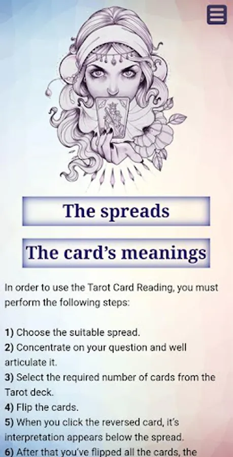 In this app you’ll find many different kinds of Tarot card’s spreads which aims to explore all spheres of your life.