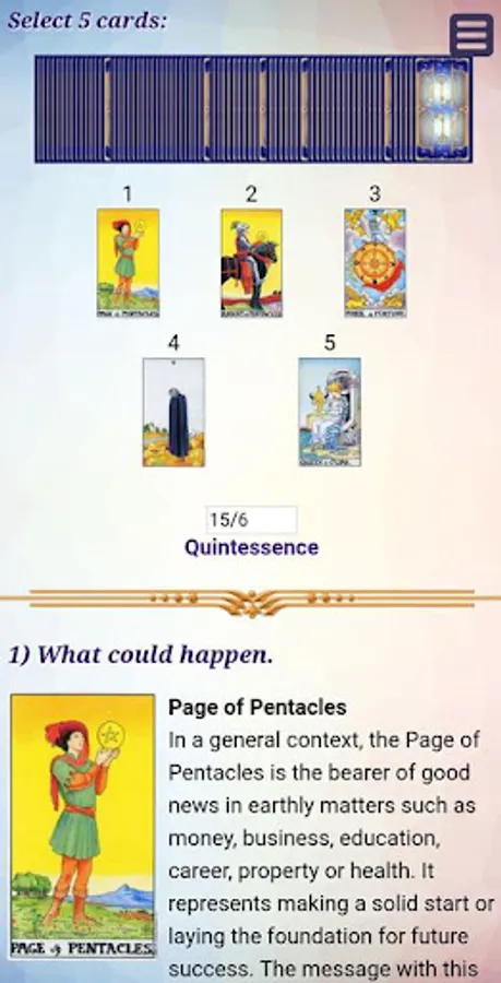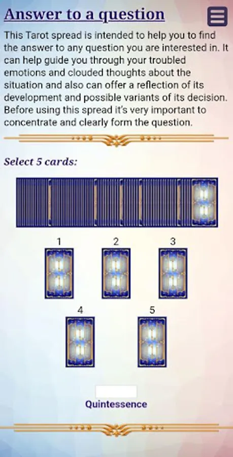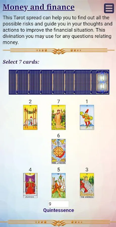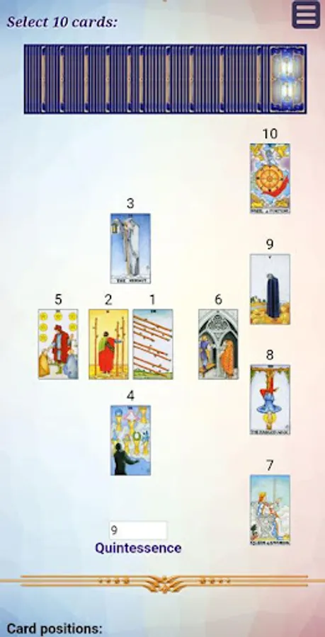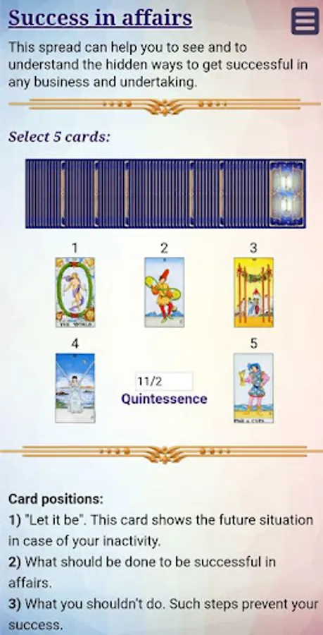 6) After you’ve flipped all the cards, the spread’s quintessence will be calculated and you may read it by clicking the “Quintessence” button.