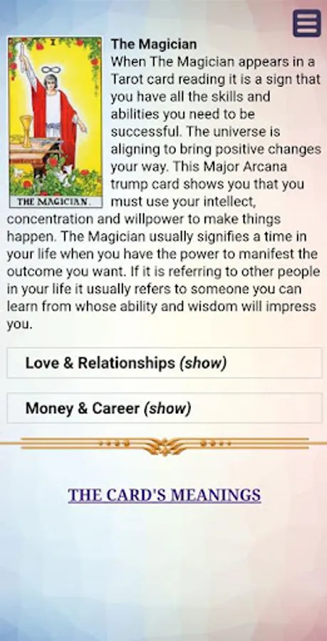 This app might become an indispensable helper for both an experienced tarot reader and the beginner which had never hold a real Tarot Card deck in his hands.